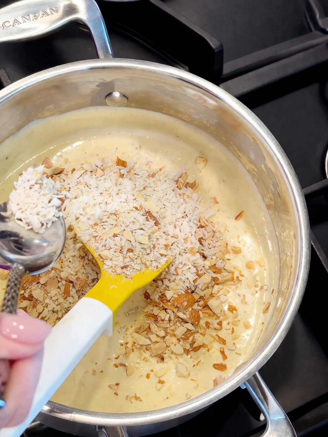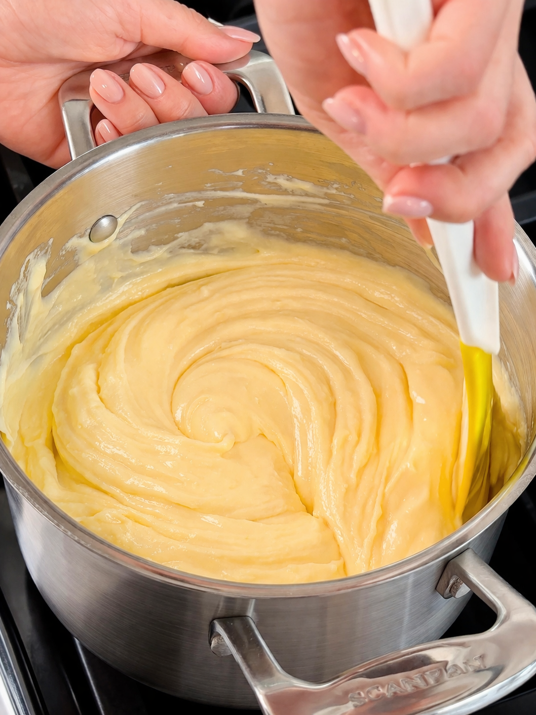 2. Каструлю поставити на вогонь і, постійно помішуючи, довести до кипіння, але не кипʼятити. Маса має стати рідкою. Після цього зняти її з вогню.