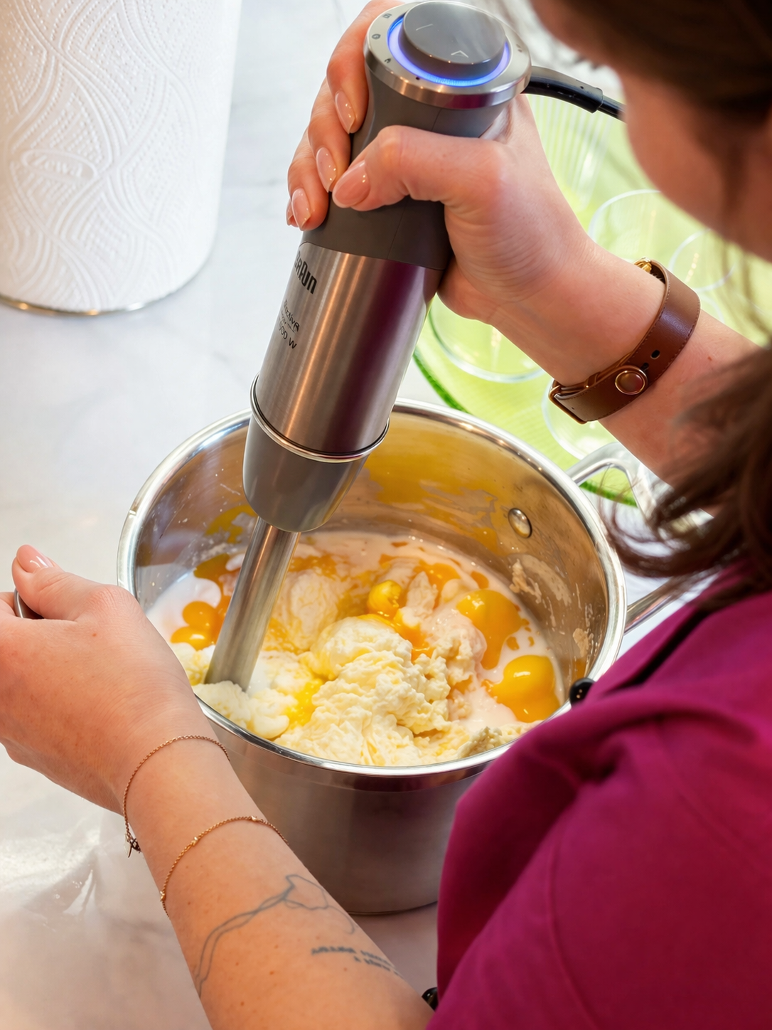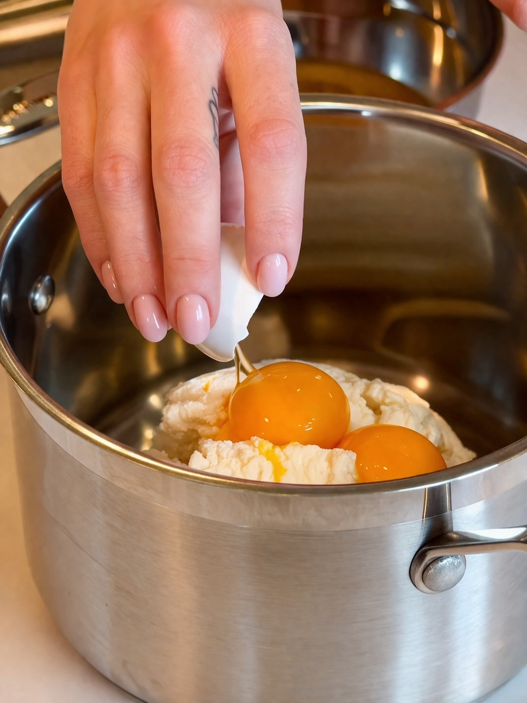 1. Зцідити зайву вологу із сиру. Покласти його в каструлю, додати жовтки, вершкове масло, цукор і вершки. Перебити все блендером.