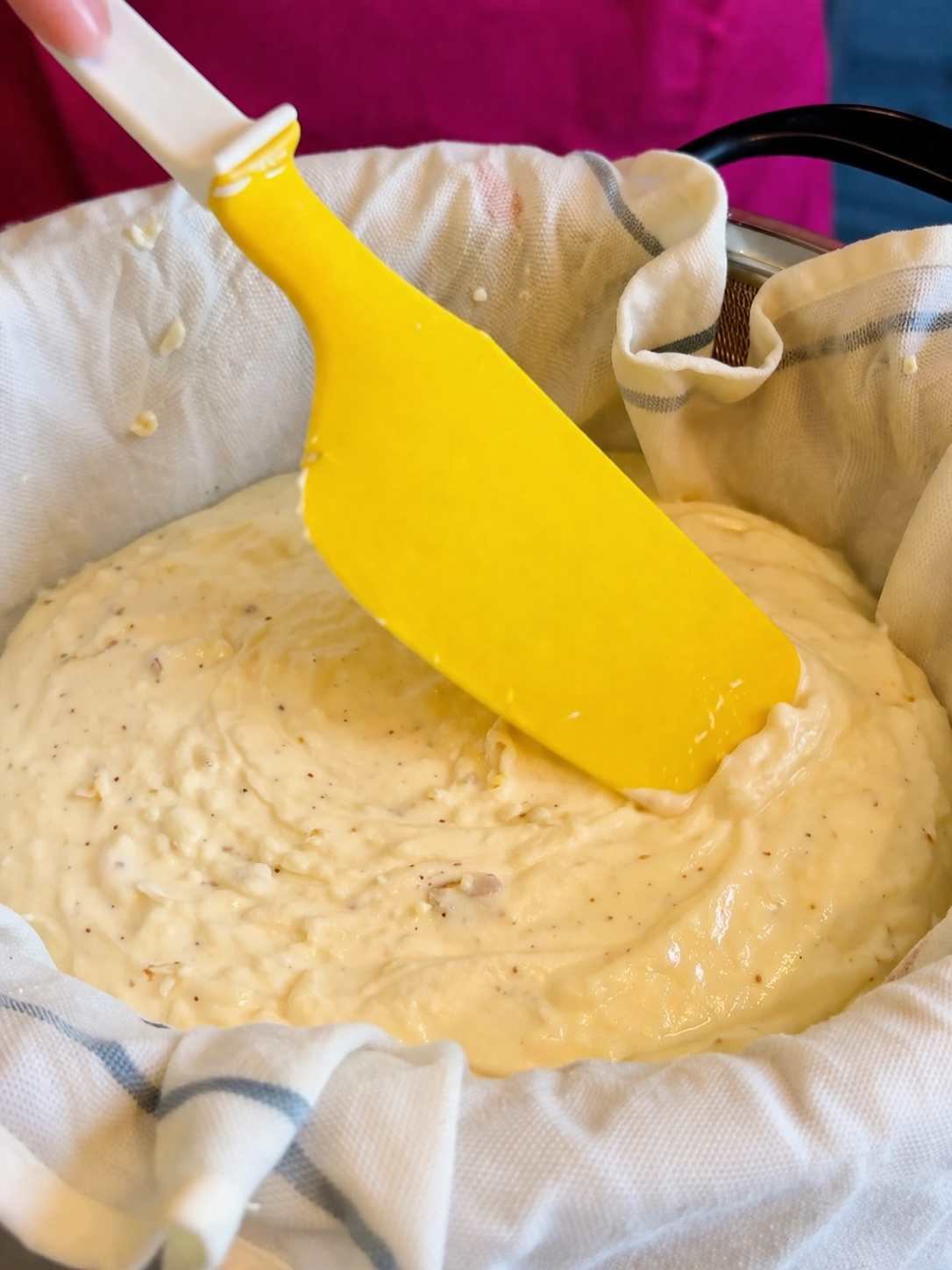 5. Якщо у вас немає спеціальної форми для сирної паски, то можна використати сито. Потрібно взяти велику миску, в неї поставити сито (так, щоб із сирної маси в ситі у миску могла стікати зайва волога). Сито застелити марлею або чистим кухонним рушником, вилити сюди сирну масу та накрити її цією ж марлею. Зверху поставити гніт і відправити в холодильник на ніч.