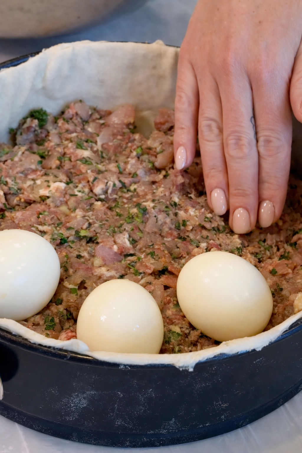 5. «Розумну» круглу форму змастити вершковим маслом і викласти в неї перший шар тіста. Викласти на тісто шар мʼясної начинки. Зробити в м’ясі заглиблення та розмістити яйця в ці заглиблення. Накрити другим шаром мʼясної начинки. Потім накрити це все другим шаром тіста. Зробити посередині пирога надріз і змастити тісто яєчним жовтком.