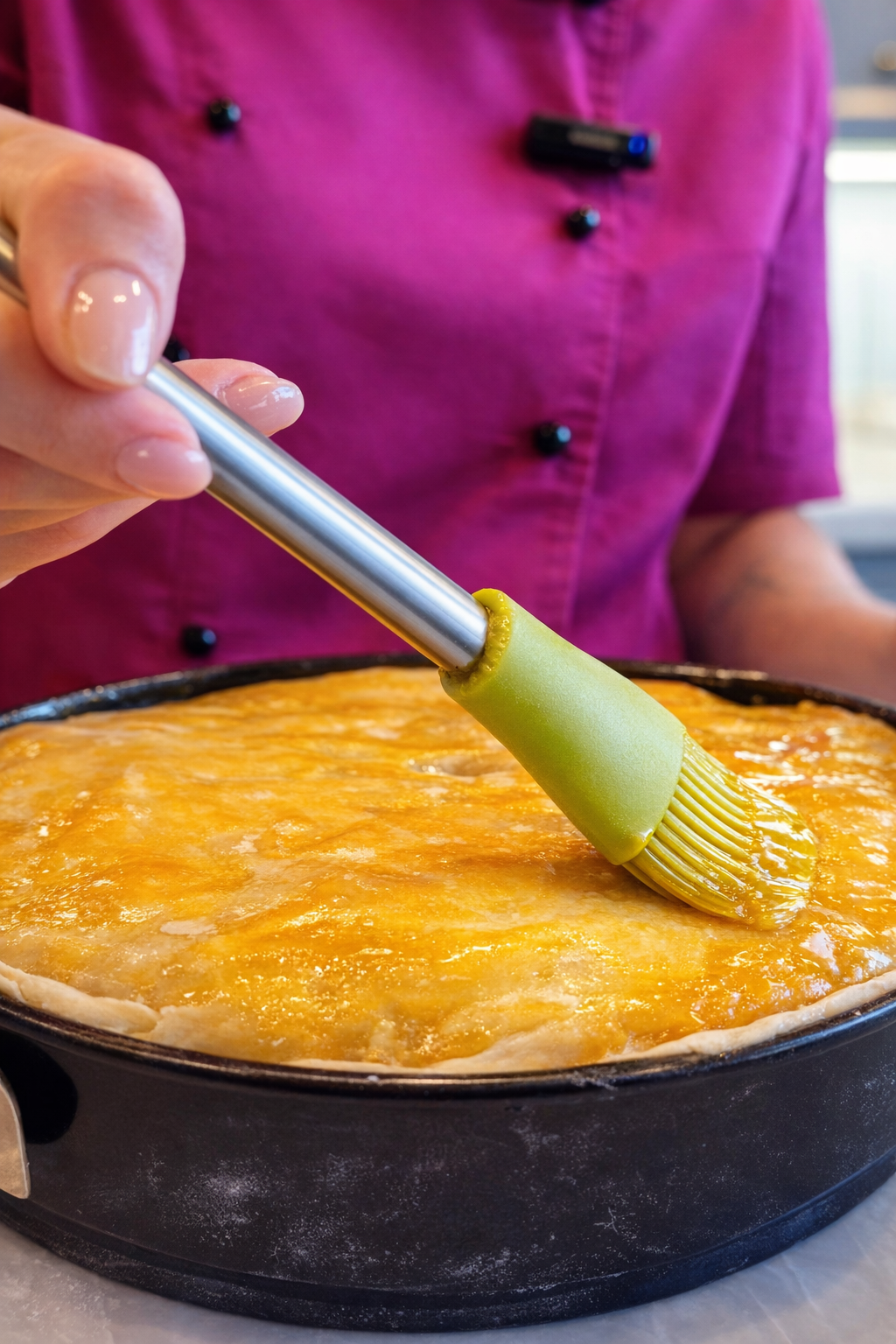 Важливий нюанс — техніка. На відміну від класичних pâté у формі теринів, цей пиріг запікають у тісті. Воно виконує функцію оболонки, яка утримує соки всередині і водночас створює контраст — хрустку, золотисту скоринку. Саме тому важливо дати пирогу «відпочити» після випікання — щоби структура стабілізувалася, а зріз залишився чистим.