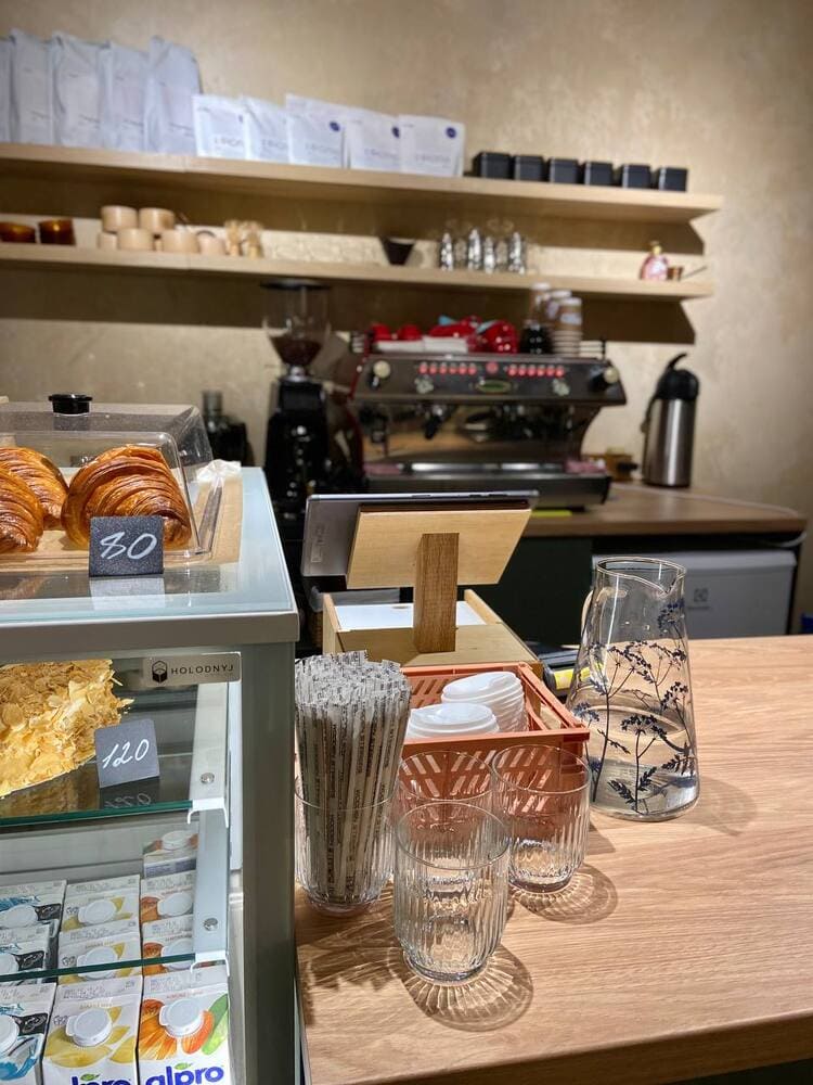 Адрес: ул. Урловская, 16 Часы работы: пн-пт 08:00-21:00, сб-вс 09:00-21:00 Цены: Эспрессо допио – 50 грн, латте – 60 грн, пряный чай масала – 70 грн, наполеон – 100 грн, медовик – 90 грн, классические и миндальные круасаны 70 грн