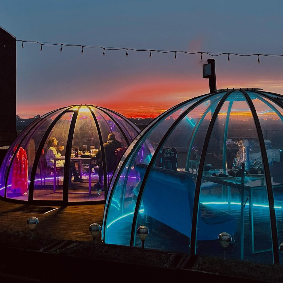 Особенность заведения — стеклянные прозрачные купола, в которых в любую погоду можно отпраздновать день рождения, посмотреть кино или устроить свидание.