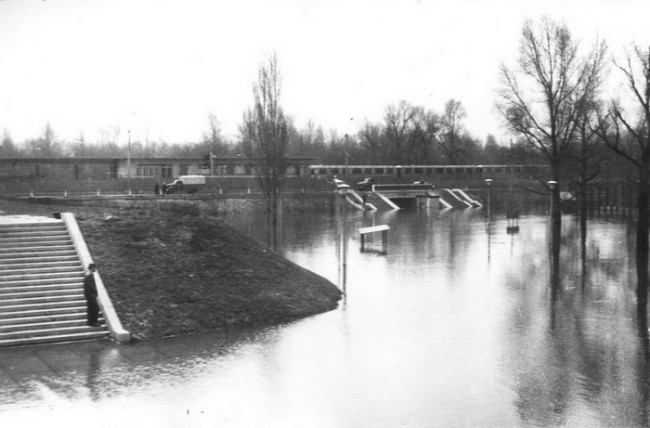 Апрель 1970 года. Из-за паводка в Гидропарке станция метро была закрыта, но метрополитен не прекращал свою работу, поезда обходили станцию без остановок.