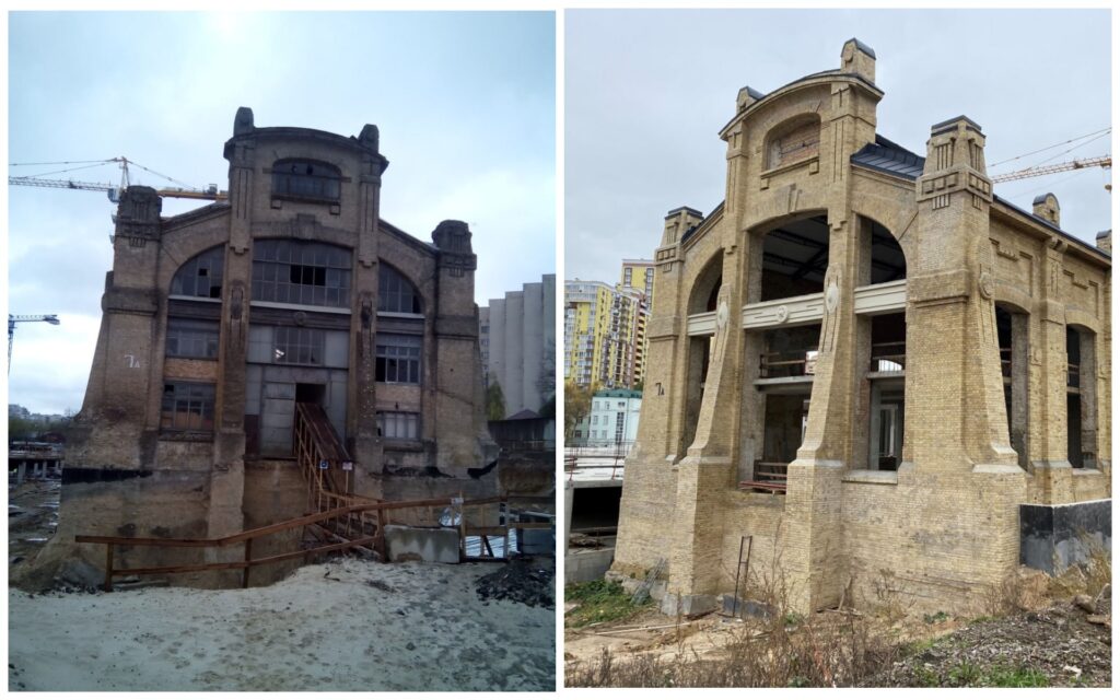 В качестве подтверждения девелопер показал фотографии другой архитектурной памятки — здания электростанции Лукьяновской городской железной дороги. Она расположена на том же объекте строительства и уже находится на заключительном этапе реставрации.