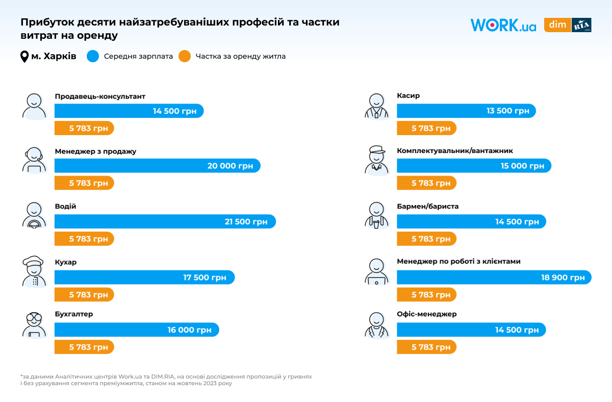 В столице жилье легче всего снимать менеджерам по продажам — эти специалисты зарабатывают в среднем 30 000 грн, поэтому на аренду тратят 52% дохода. Тяжелее всего приходится комплектовальщикам и грузчикам — при средней зарплате в 16 500 грн, они в среднем тратили бы на однокомнатное жилье 94% заработанных средств.