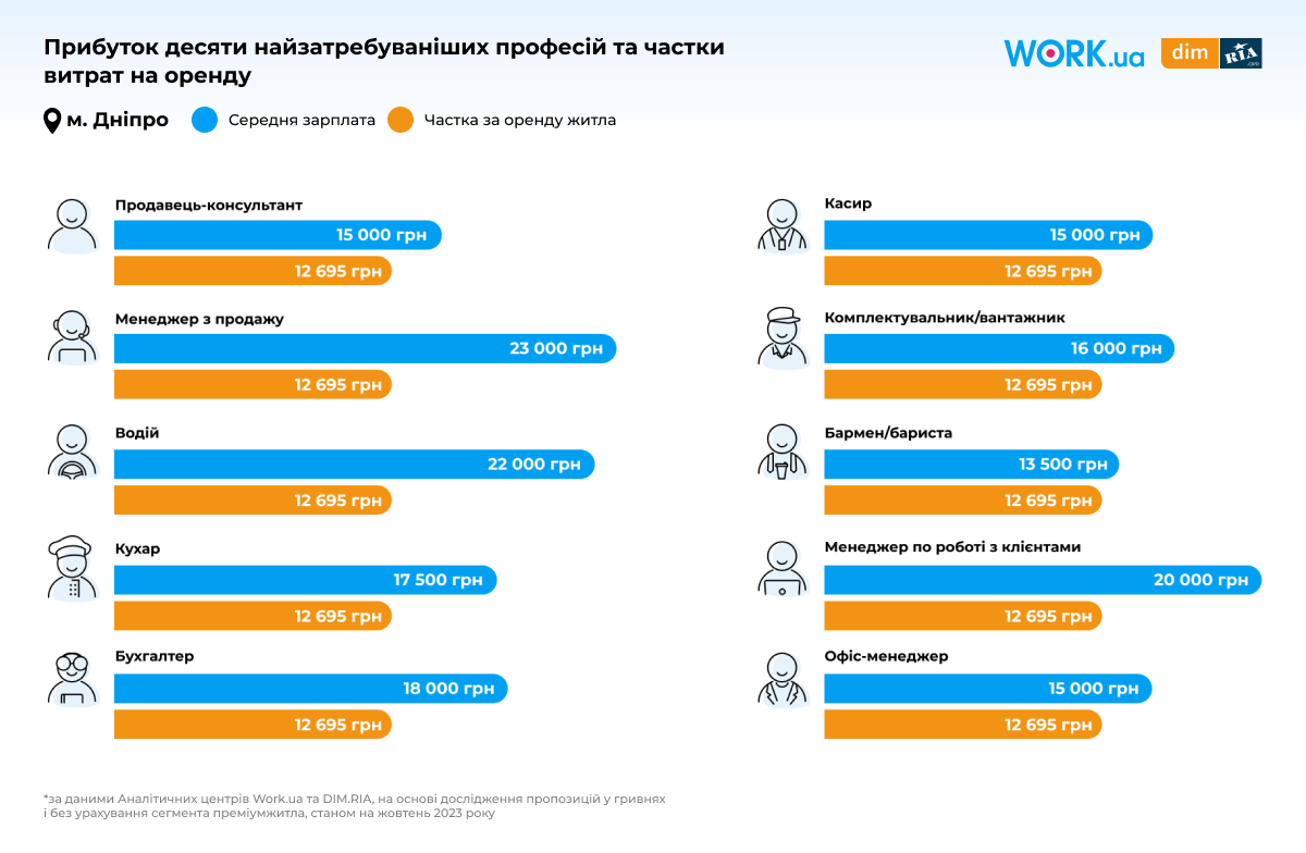 В Днепре, как и в Киеве, аренда жилья наиболее доступна менеджерам по продажам: из средней зарплаты в 23 000 грн однокомнатная квартира «съедает» в среднем 55%. Тяжелее всего приходится барменам и баристам (за аренду квартиры нужно отдать 94% зарплаты), кассирам и офис-менеджерам (85%).