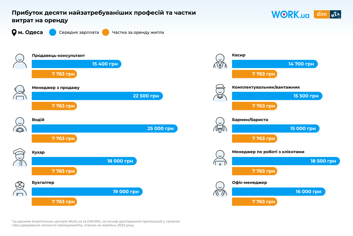 В Одессе легче всего снимать жилье водителям — с их средней зарплатой в 25 000 грн на аренду придется потратить 31% дохода. Более 50% зарплаты в Одессе на аренду жилья тратят только бармены и баристы (52%).
