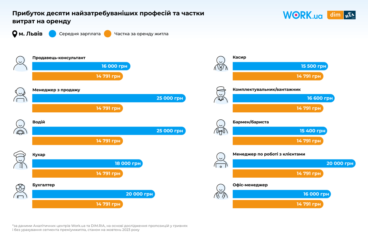 Самые высокие цены во Львове — здесь представителям всех самых востребованных профессий придется тратить на съем однокомнатной квартиры более половины зарплаты. Очевидно непосильной является аренда для продавцов-консультантов, офис-менеджеров (92%), кассиров (95%), барменов и барист (96%).
