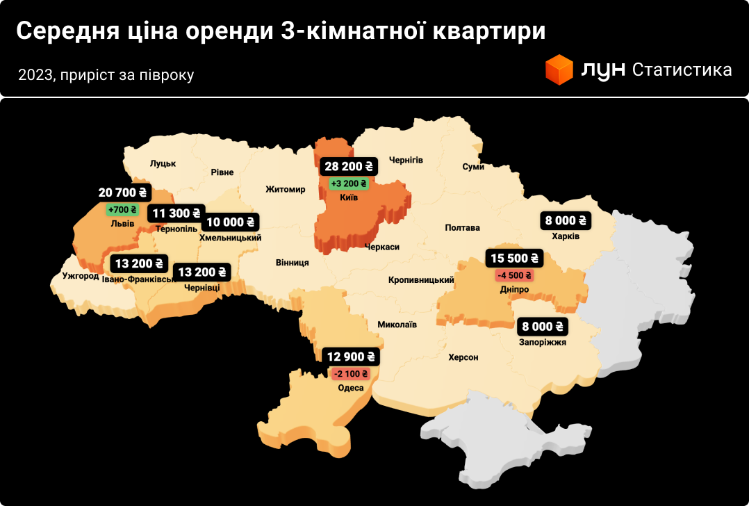 Цена аренды трехкомнатной квартиры в Одессе за полгода подешевела на 2100 грн. и обойдется в 12900 грн., а во Львове выросла на 700 грн. — до 20700 грн. Средняя цена аренды квартиры с тремя комнатами в Киеве самая большая – 28200 грн (+3200 грн за полгода), во Львове – 20700 грн (+700 грн).