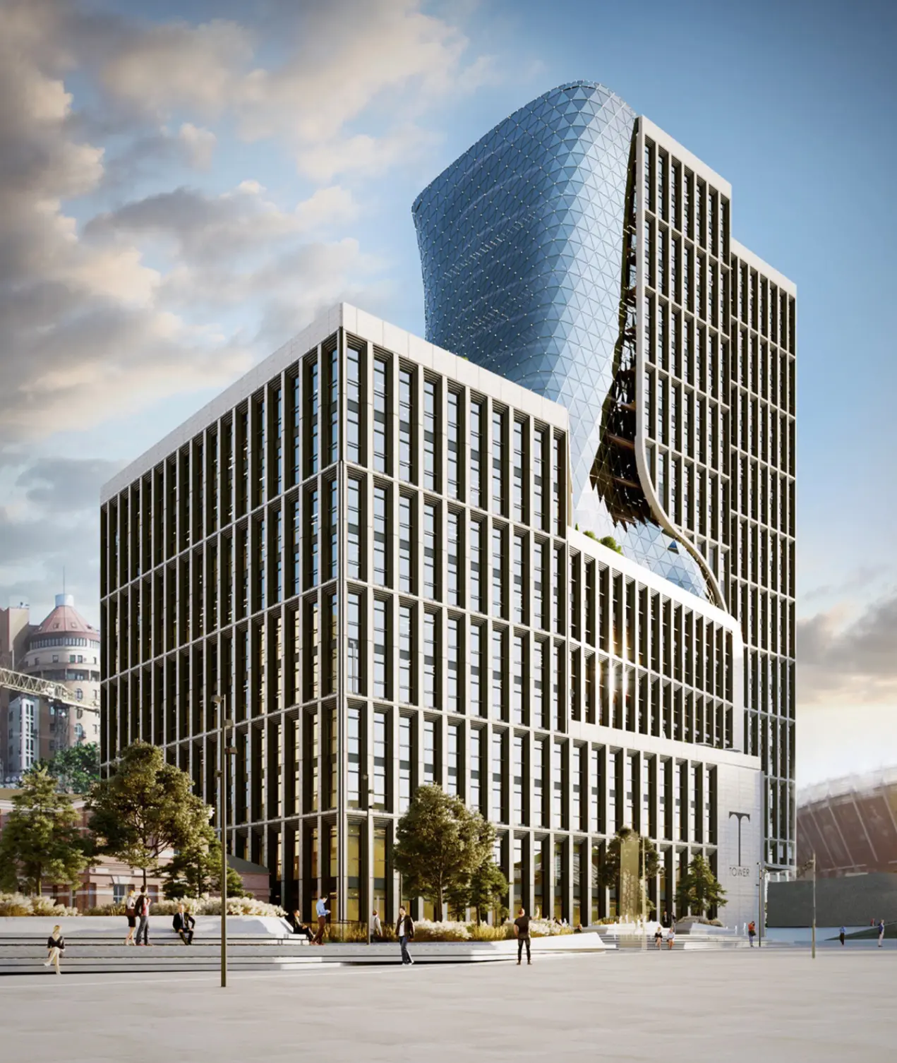 Архитектурная компания AIMM опубликовала визуализацию проекта строительства бизнес-центра Т-Tower и реконструкции Троицкой площади возле Олимпийского стадиона.