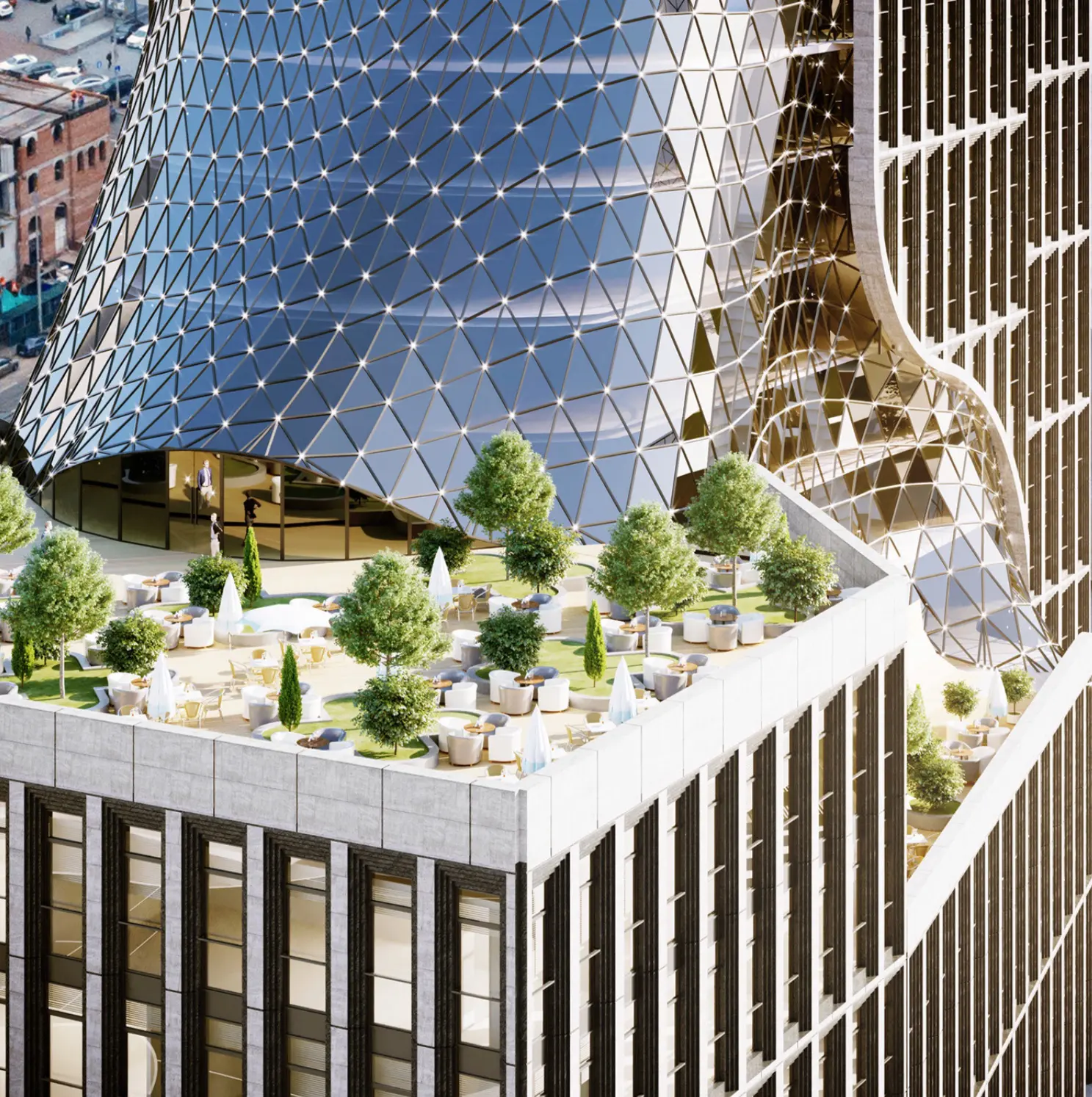 Здание 21-этажного бизнес-центра, по словам архитекторов, «символизирует раскол между прошлым и будущим».