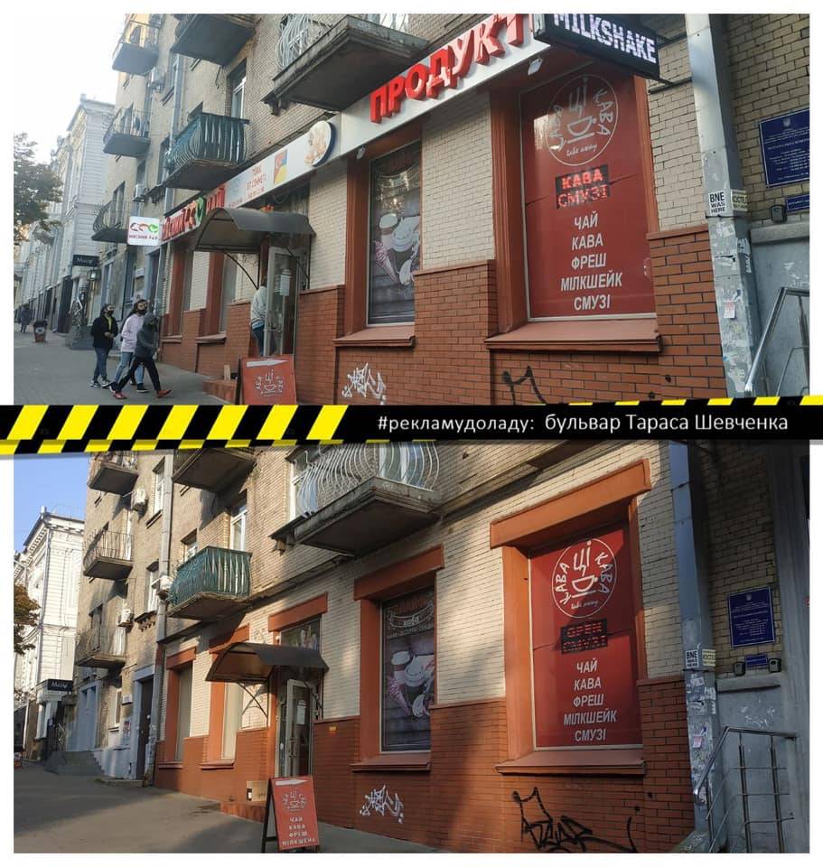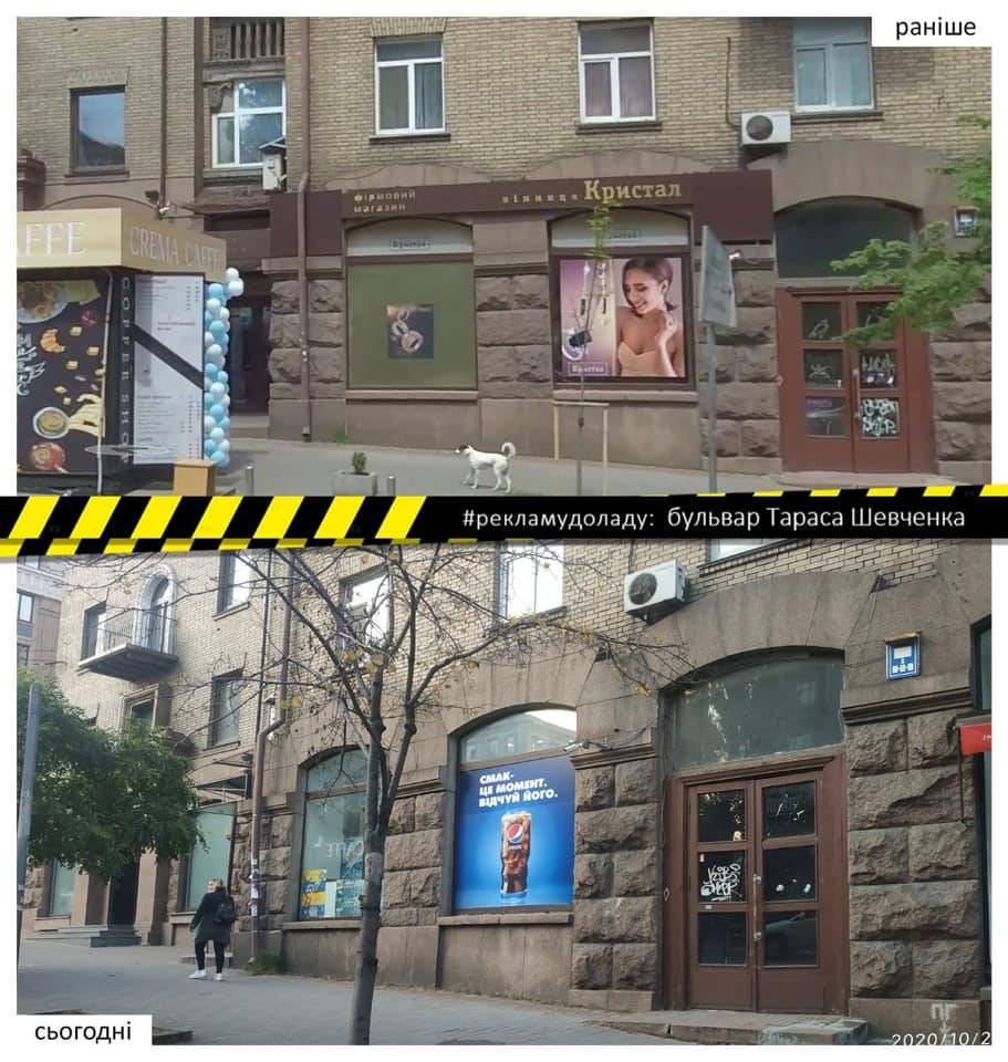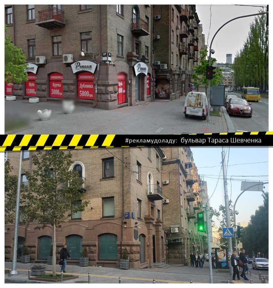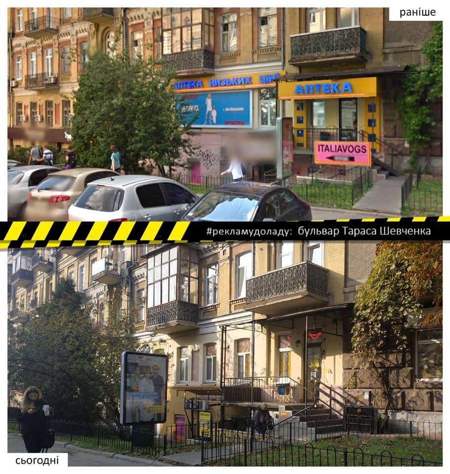 Фасады зданий на бульваре Тараса Шевченко очистили от рекламных вывесок. Фотографиями поделился на своей странице в Facebook начальник управления по вопросам рекламы Александр Смирнов.