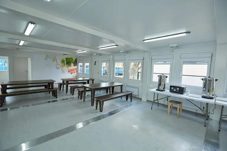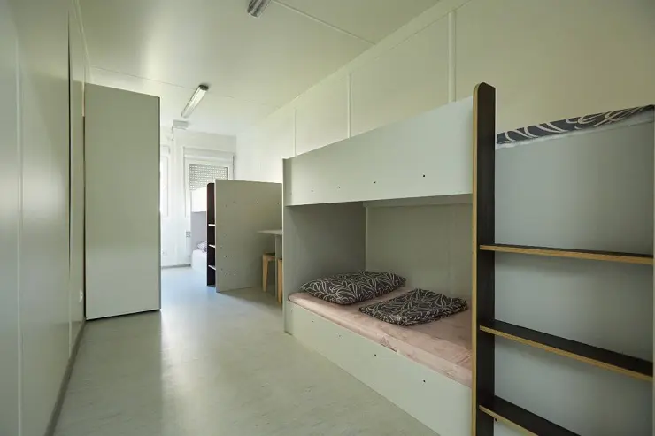 В каждом городке – 88 жилых модулей, рассчитанных на 352 человека. Здесь есть туалетные и душевые комнаты (отдельно мужские и женские), столовые и детские/учебные.