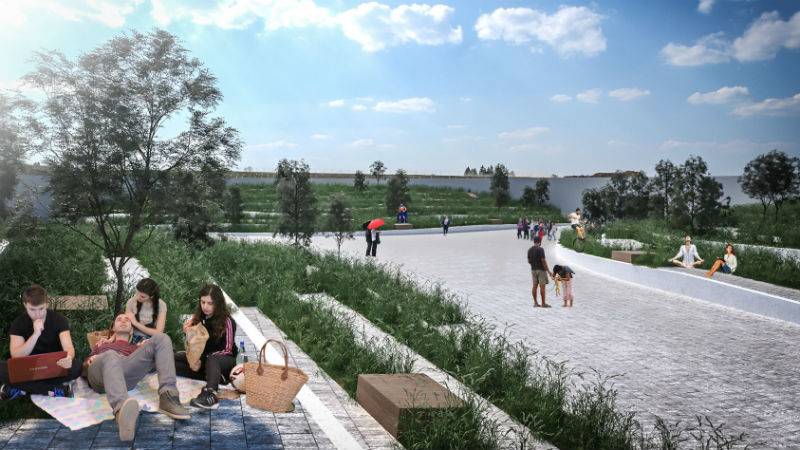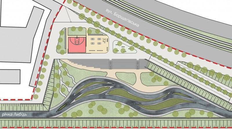 Место, где Лыбедь выходит на поверхность из-под бетонных тоннелей, а это 900 метров береговой линии в районе КПИ, превратят в публичное пространство. Там появится зеленая набережная, сквер, места для отдыха. Также установят систему очистки воды в реке и высадят растения, которые будут способствовать этому же.