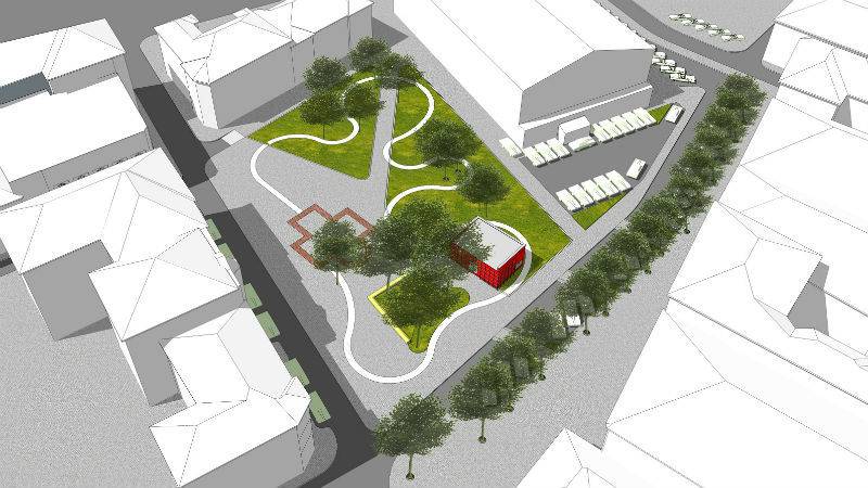 Должно стать: общественное пространство вокруг фундамента церкви, которая когда-то находилась на площади, новая уличная мебель, освещение и деревья