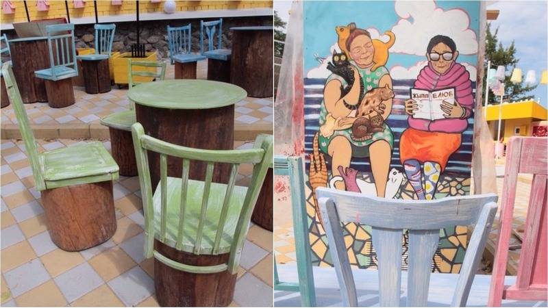 Дизайн пространства выполнен в стиле ретро: здесь установили разрисованные автоматы для газировки, барную стойку, сделанную из старого УАЗика, фотопанно, украшенное советскими предметами быта — феном, грелкой, лотком для яиц, креманками для мороженого — и стену с цветочными горшками в виде скворечников.