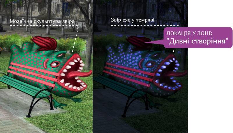 Шесть арт-объектов зоны “Странные существа” покроют люминесцентной краской и зеркальной мозаикой. Ночью они будут светиться.