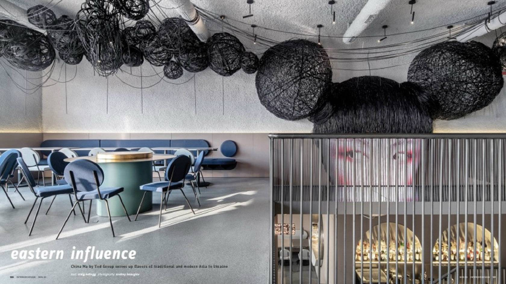 Проект ресторана China Ma, который находится возле Южного вокзала в Киеве, был опубликован в американском Interior Design Magazine и попал на обложку ноябрьского номера. Дизайн интерьера разрабатывала команда YOD Group.