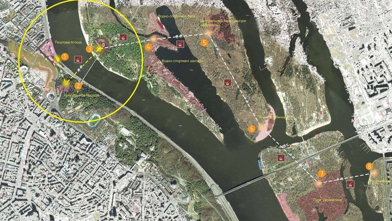 Полностью канатная дорога, длиной более пяти километров, будет состоять из восьми станций. По словам архитектора, маршрут будет соединять центр Киева не только с Трухановым островом и Гидропарком, но и с районом станции метро «Левобережная» и Русановкой. По его словам, это позволит разгрузить левый берег Киева от пробок и большого скопления людей в метро в период пиковых часов.