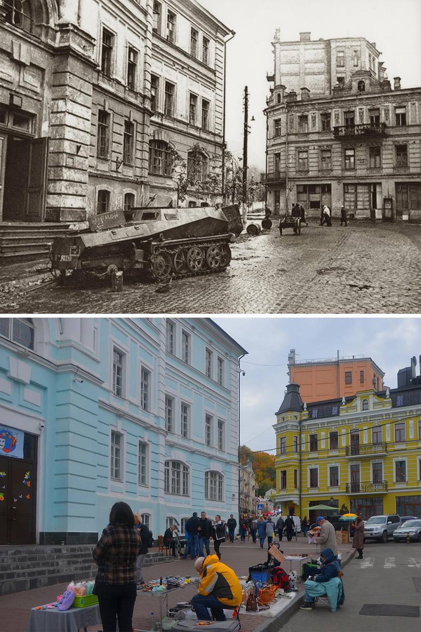 Действительно, город тогда поддавался мощным авиационным ударам, но в отличие от нынешних хаотических российских, немцы наносили их точечно – по военным объектам и предприятиям: первые удары повредили военный завод № 43 по Брест-Литовскому шоссе, завод «Большевик», аэродром « Жуляны», ж/д вокзал. Сам город и жилые кварталы не подвергались значительным атакам, чего не скажешь о нынешних ракетных ударах россиян. Взять хотя бы печально известную атаку осенью прошлого года, когда иранский дрон убил людей в старинном доме на улице Жилянской и разрушил само здание. Ему удалось выстоять во время Второй мировой, но российскую агрессию оно не выдержало.