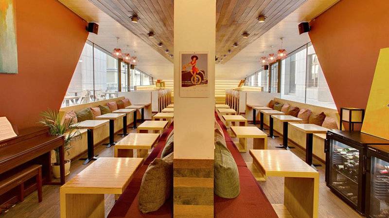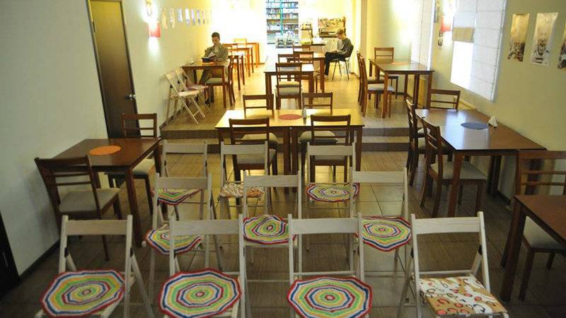 Здесь можно отдохнуть за чашкой кофе, перекусить, почитать, взять книгу напрокат, послушать музыку или лекцию.