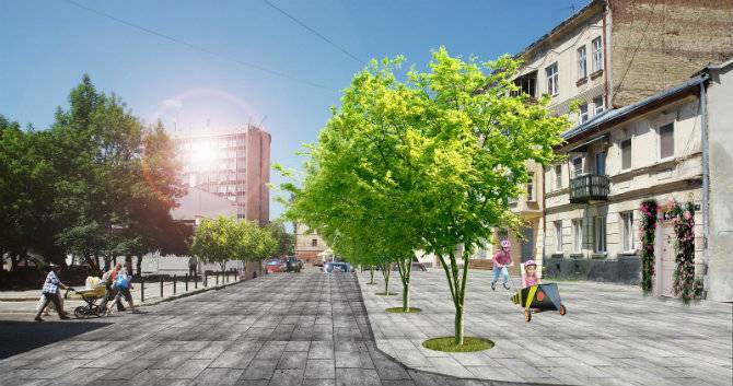 Сейчас улица выглядит, как мощеная мостовая без разметки. Кто был во Львове, знает манеру водителей ставить машины посреди улицы, это порождает невозможность обгона и свободную интерпретацию разметки. Кроме того, на этой улице нет парковки. Зато там есть две школы, и мы хотели сделать так, чтобы в любом месте улицу можно было перейти безопасно, а не как сейчас.
