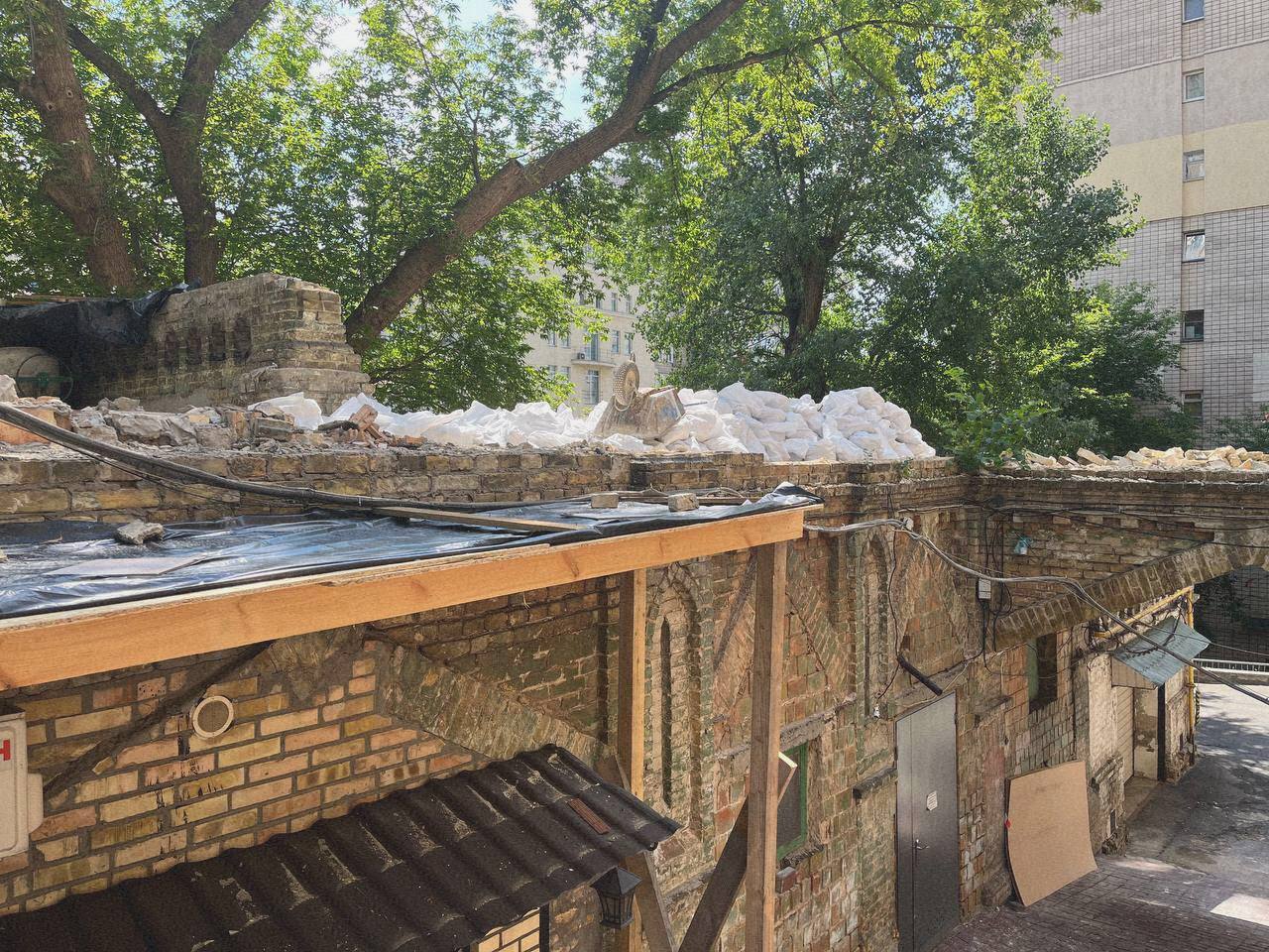 В настоящее время работа приостановлена, однако столетний кирпич сложили в мешки и вывезли.