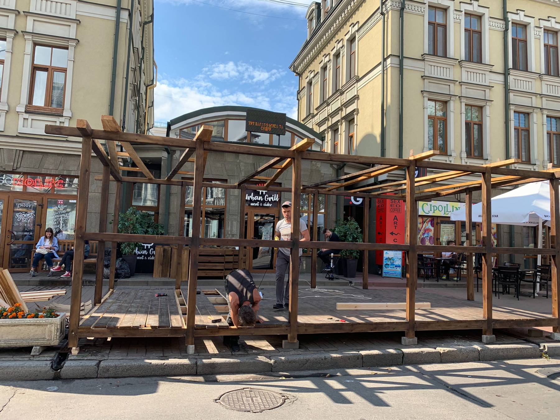 На Подоле на улице Хорива владельцы нового ресторана Urban Grill начали строить на тротуаре летнюю террасу. Об этом сообщили пользователи сообщества «Подоляночка».