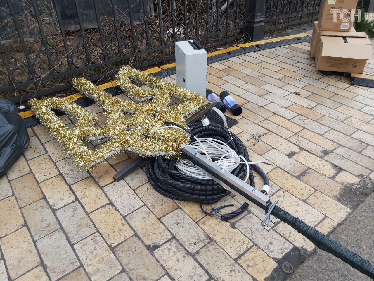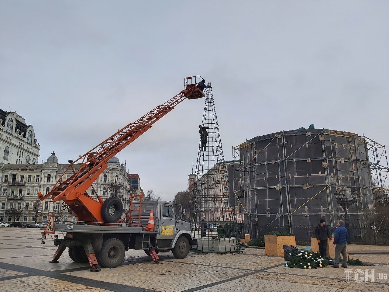 Рабочие уже сняли с елки искусственную хвою, игрушки и герб Украины, который в этом году украшал макушку. При помощи подъемника разбирают металлический каркас елки.