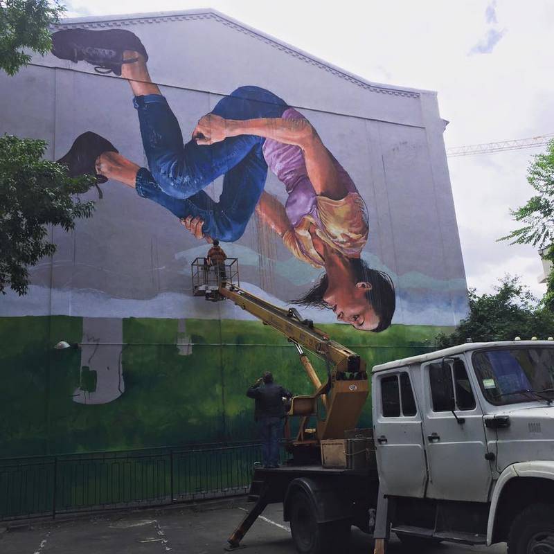 В центре Киева на фасаде жилого дома по улице Стрелецкая, 12 появилось огромное граффити. Это изображение украинской гимнастки Анны Ризатдиновой в момент, когда она делает сальто.