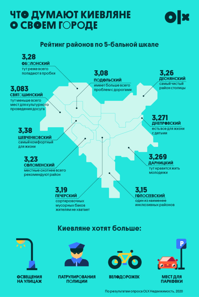 Что касается инфраструктуры, то в Дарницком, Соломенском, Оболонском и Подольском районах жители хотели бы видеть больше парковых зон, спортивных и детских площадок. Самым развитым районом в плане инфраструктуры признан Шевченковский – 3,88 балла. В Днепровском районе, который оценили в 3,86 балла, жители предлагают построить искусственную волну для серфинга и экодомики. Для комфортной жизни на Печерске людям не хватает супермаркета АТБ. Печерский и Дарницкий районы оценили в 3,8 балла.