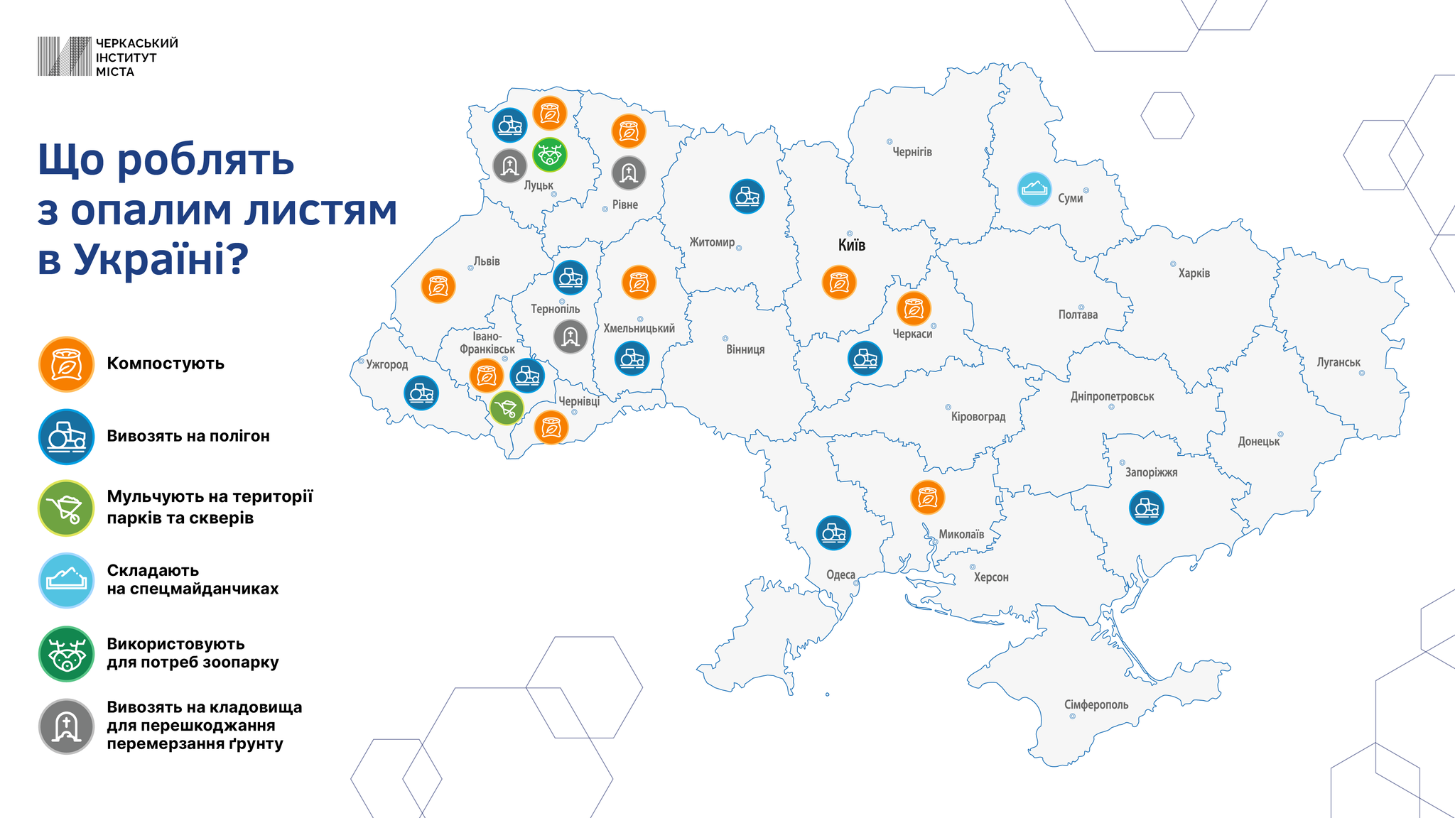 В Ужгороде и Тернополе на полигон для твердых бытовых отходов вывозятся все опавшие листья, а в Черкассах, Луцке, Житомире, Хмельницком и Ивано-Франковске те, которые не подлежат компостированию. В Сумах листья утилизируют на временных площадках для складирования растительных отходов.