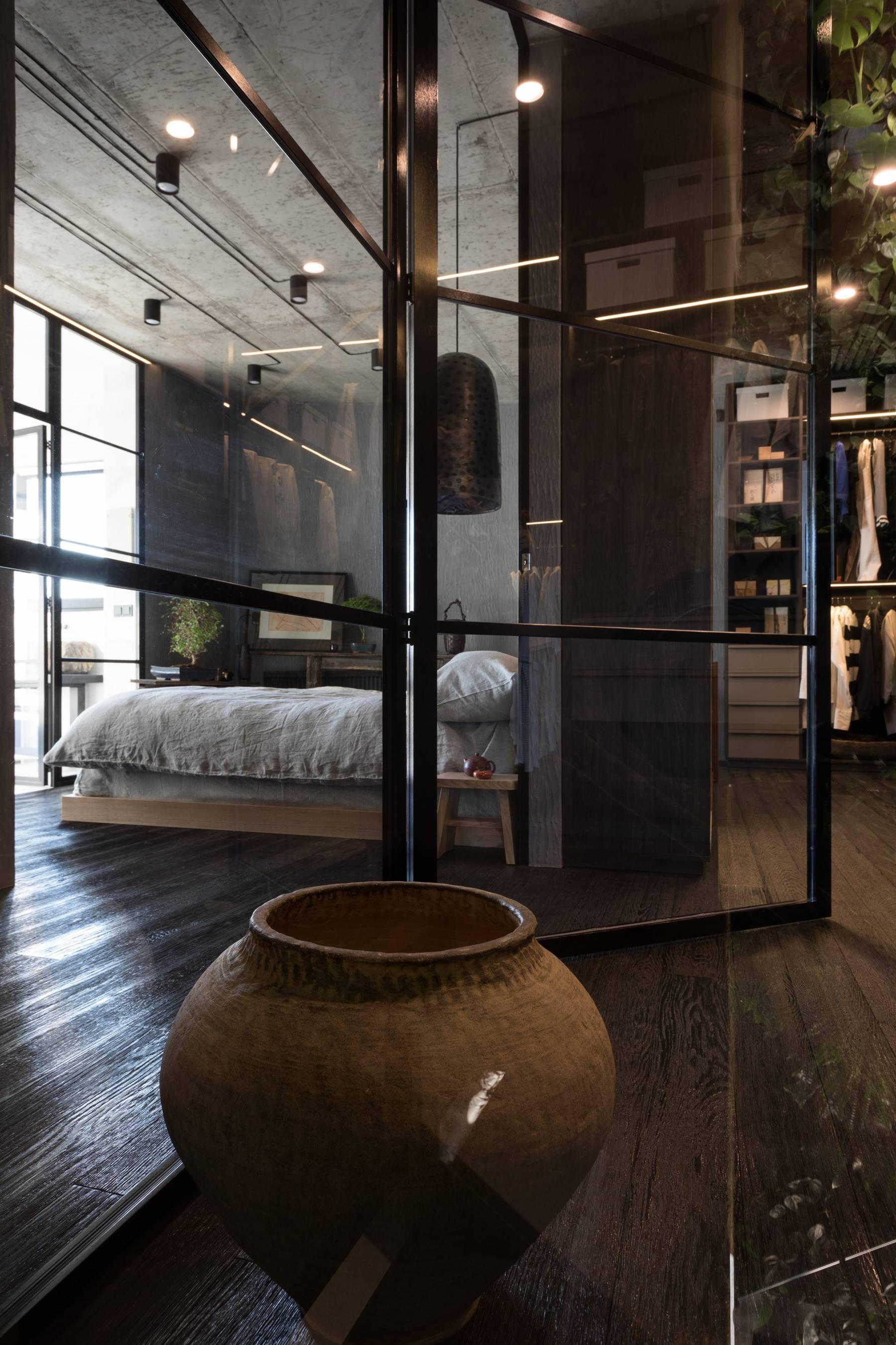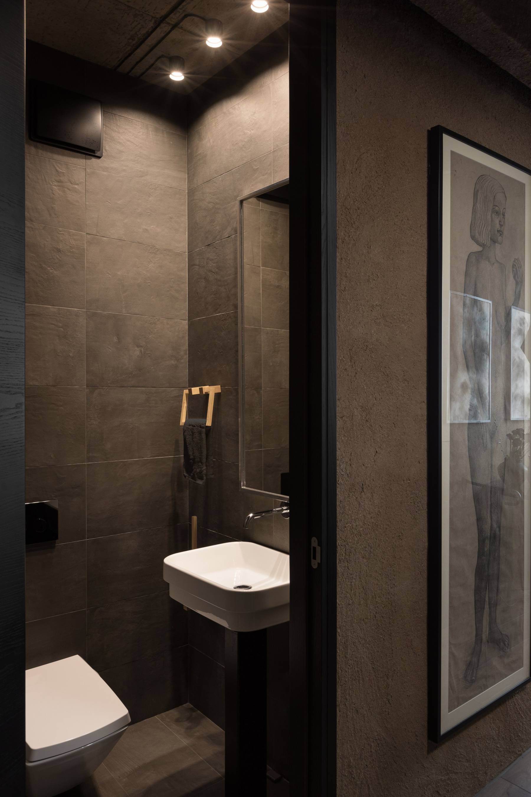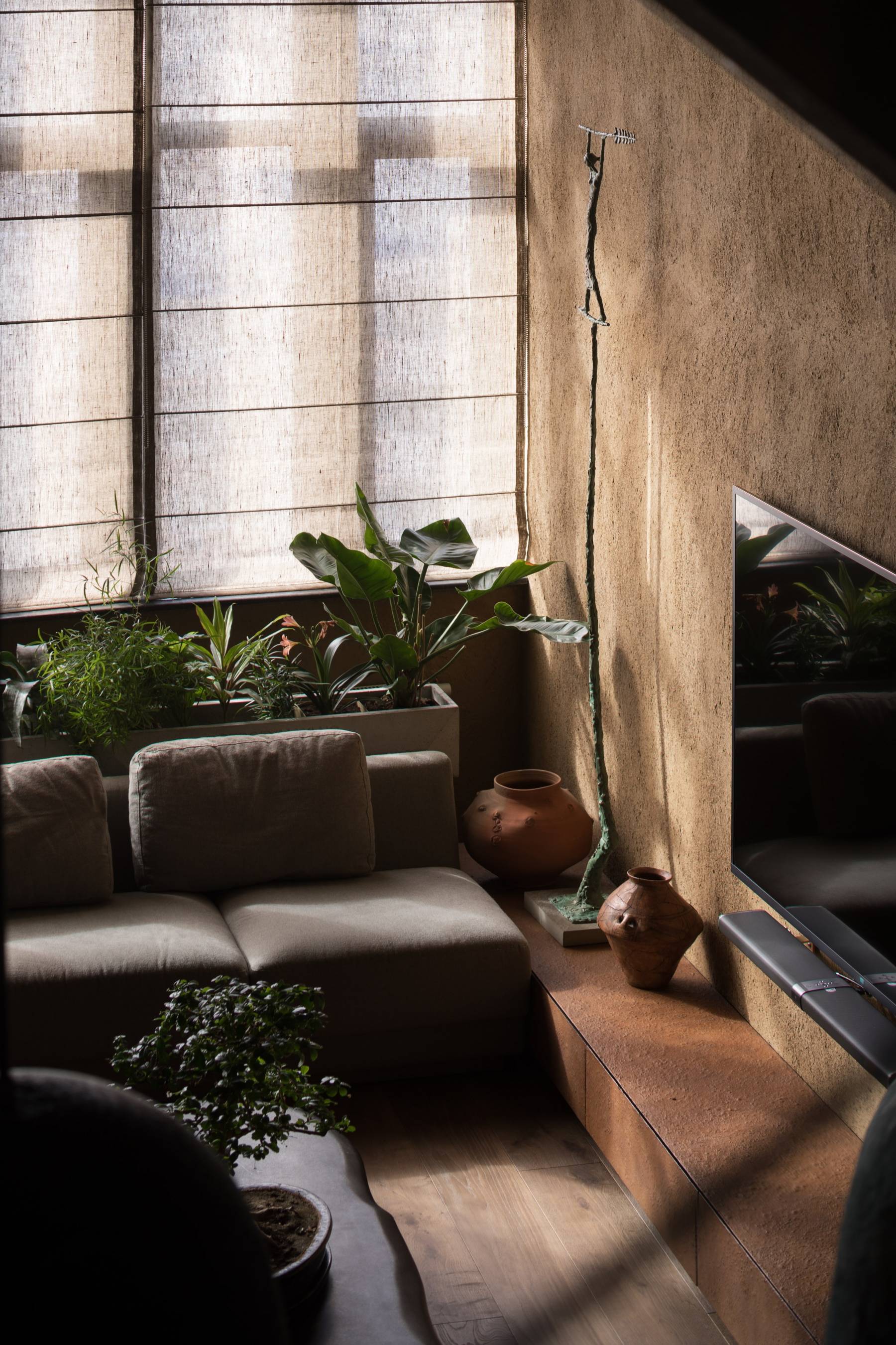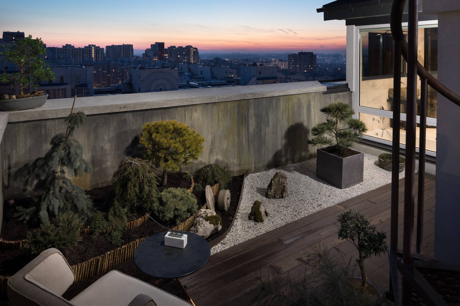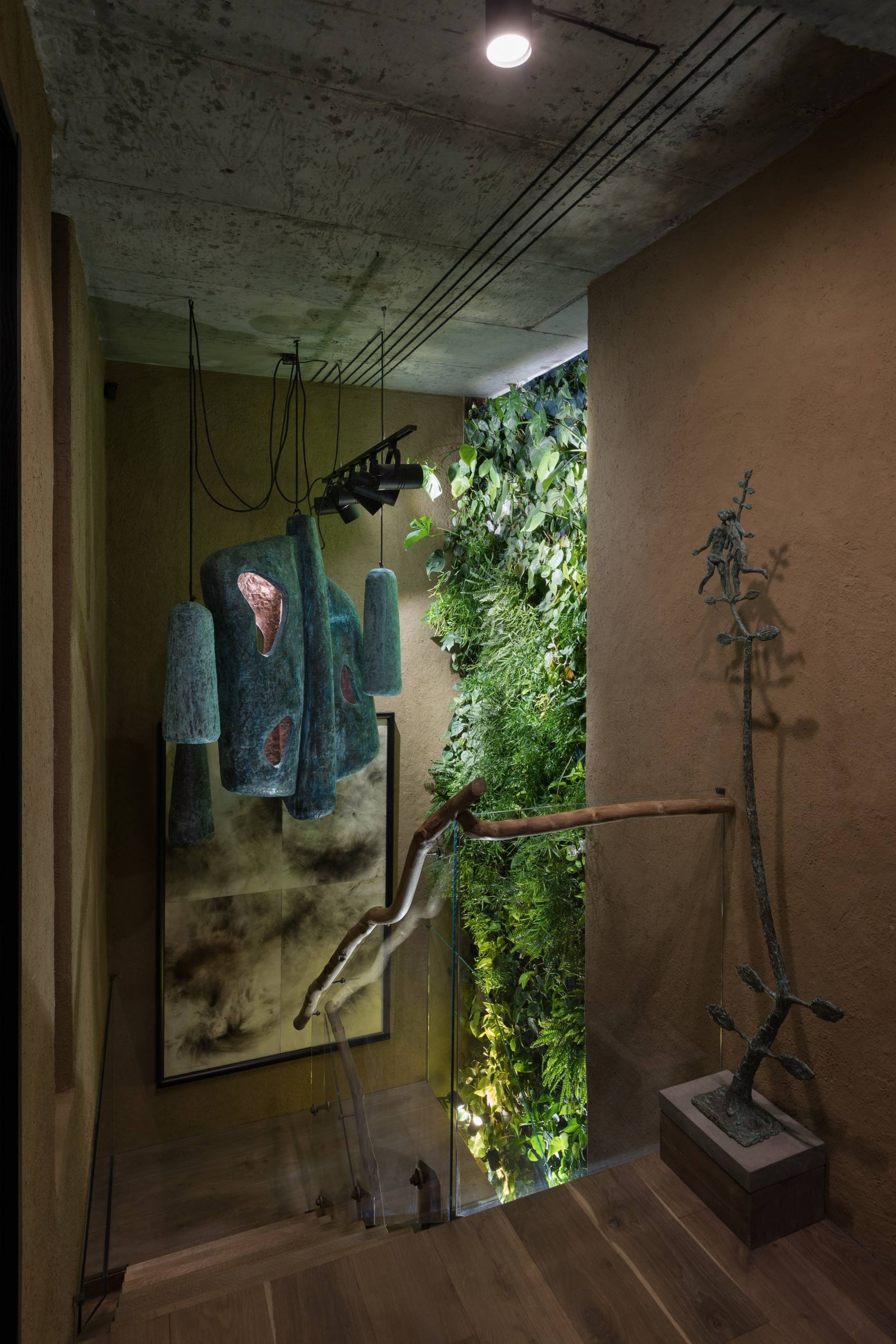 Квартира украшена коллекцией современного искусства и авторским освещением, которое студия изготавливает в собственной керамической мастерской. На террасе расположен сад бонсаев.