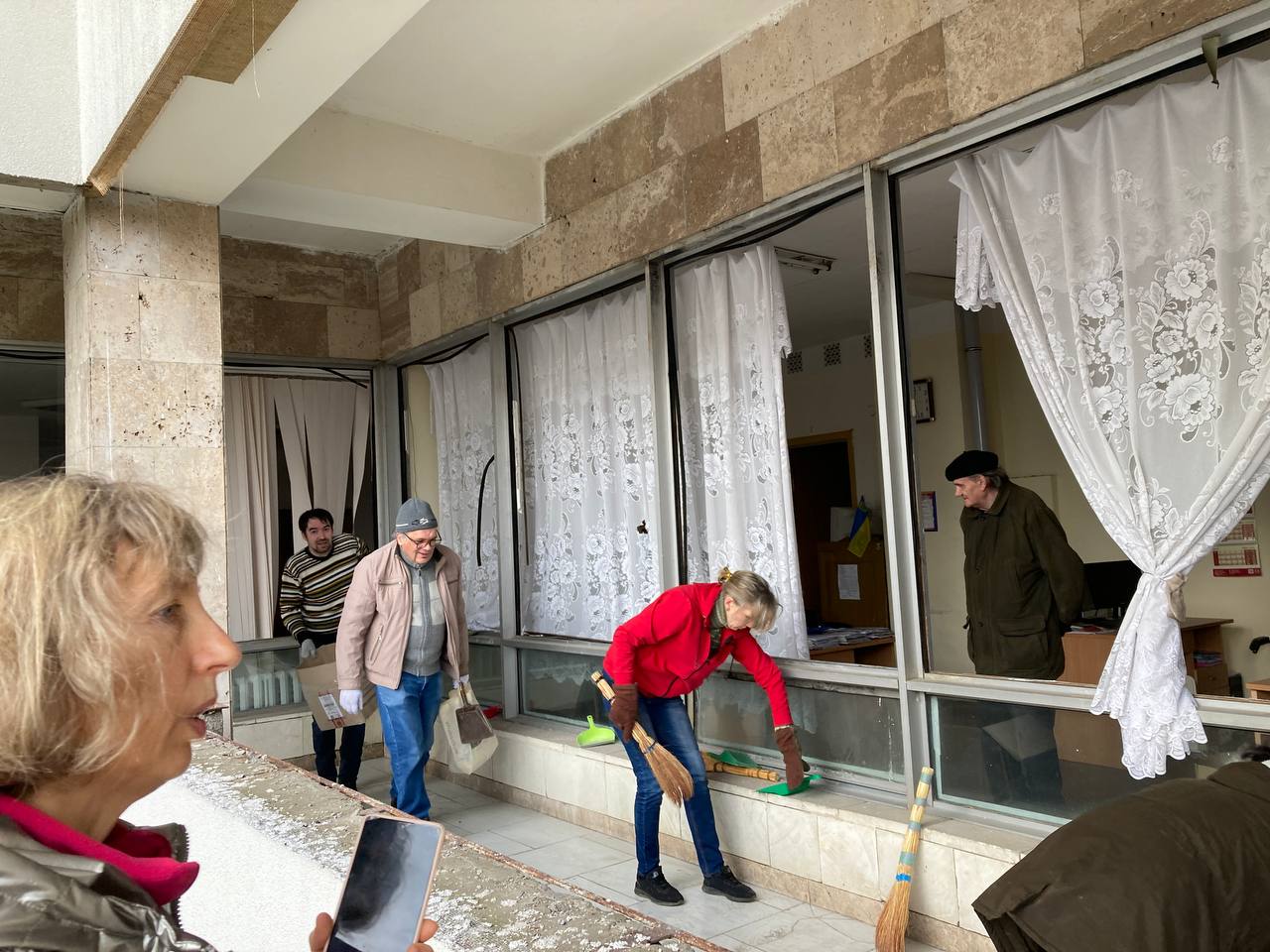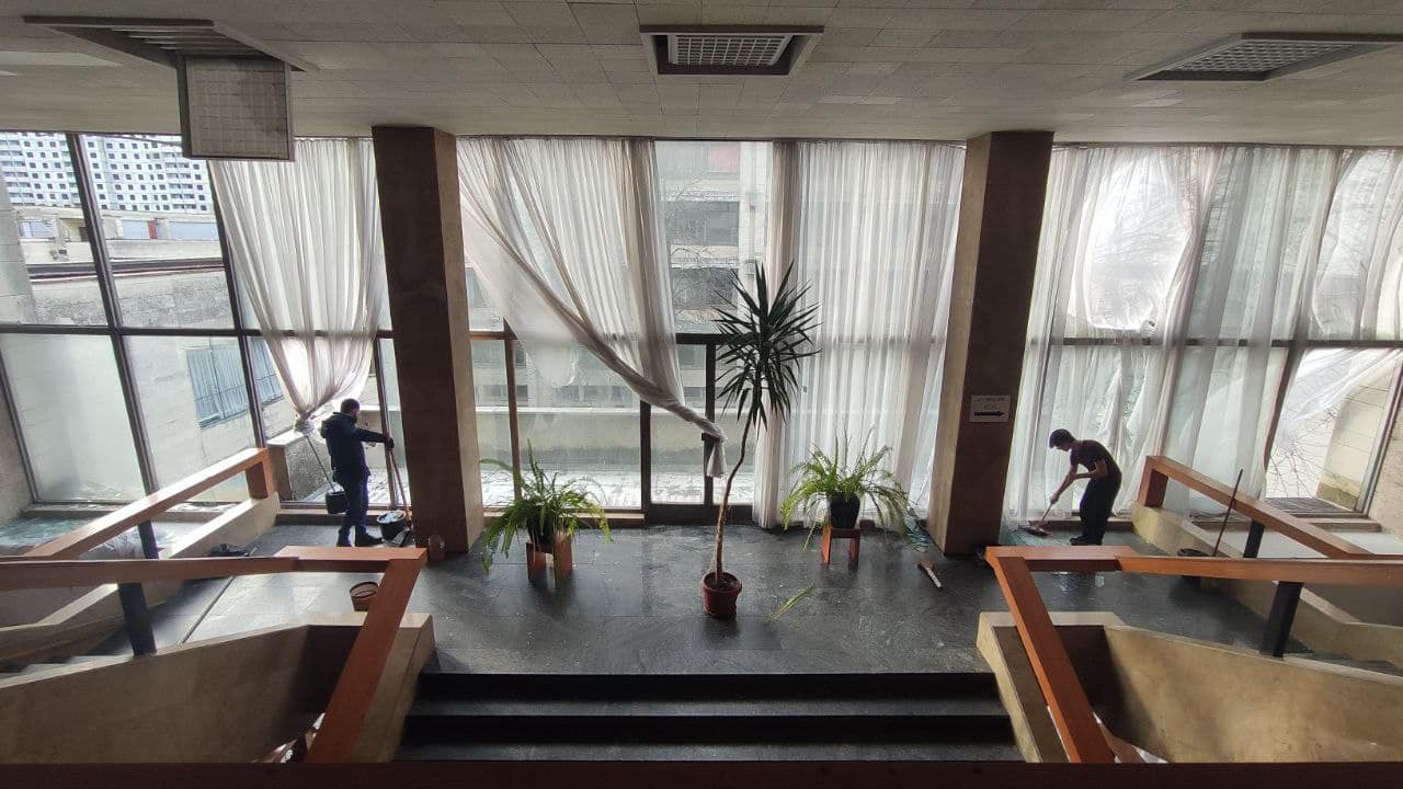Уже 1 января студенты и другие неравнодушные собрались, чтобы убрать территорию и здания от разбитого стекла. Окна закрывают пленкой и фанерой для защиты лабораторного оборудования.