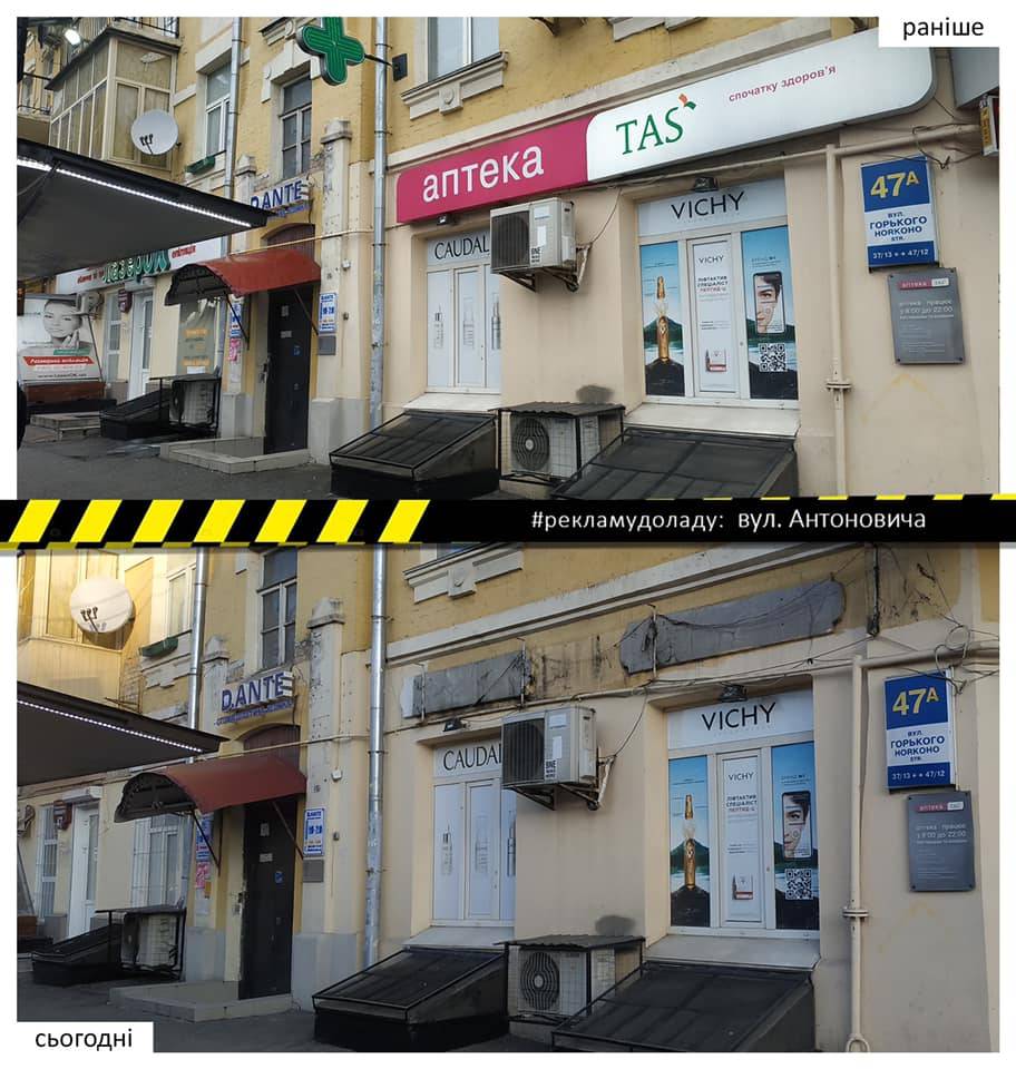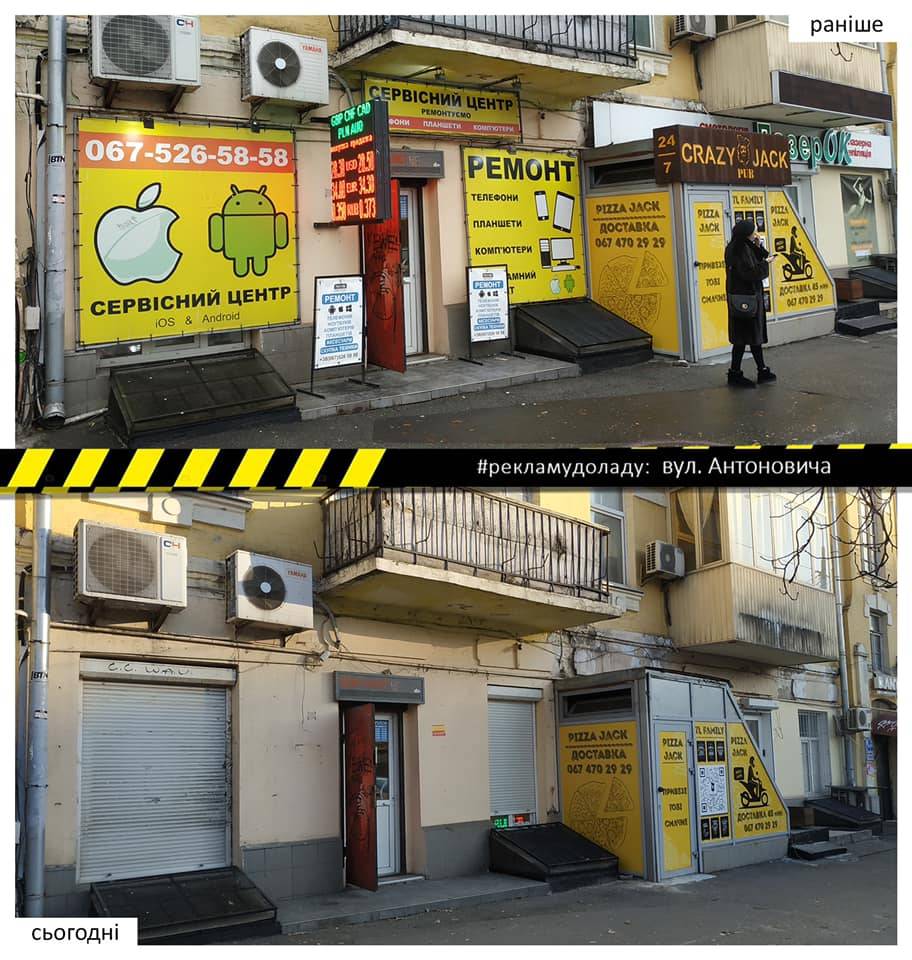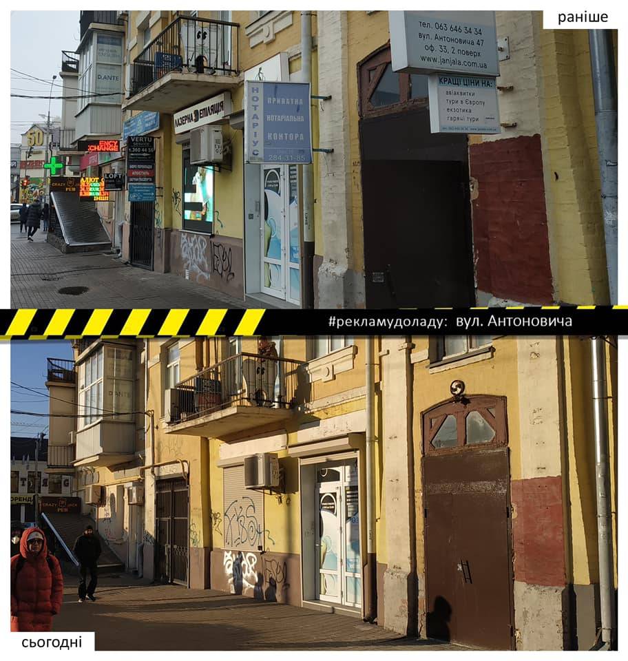 С фасадов домов на улице Антоновича демонтировали рекламные вывески, которые были размещены с нарушениями правил. Фотографиями на своей странице в Facebook поделился председатель управления рекламы КГГА Александр Смирнов.
