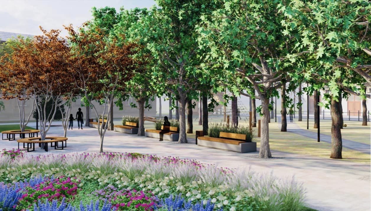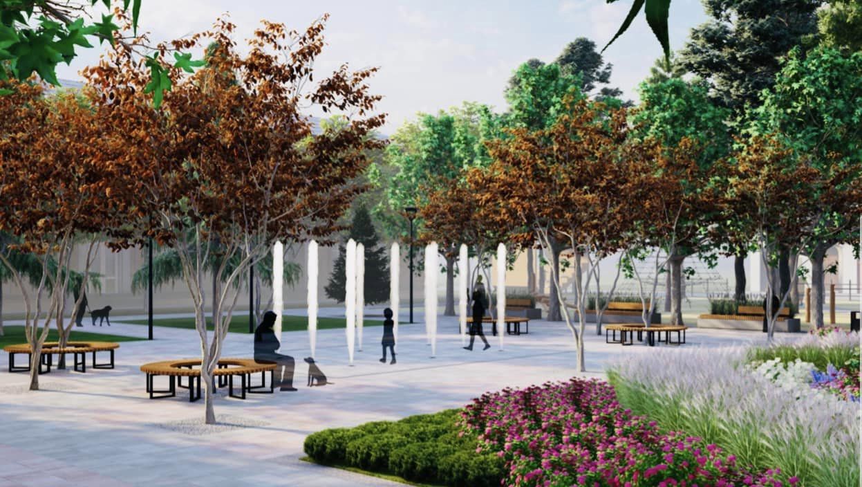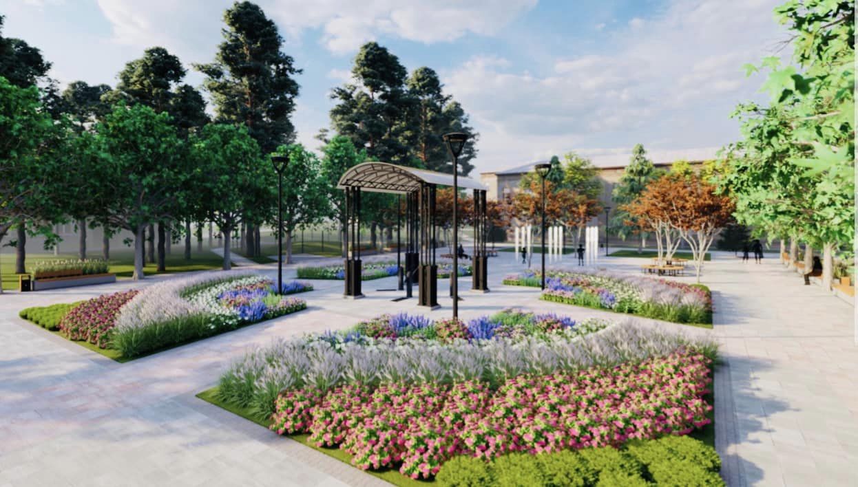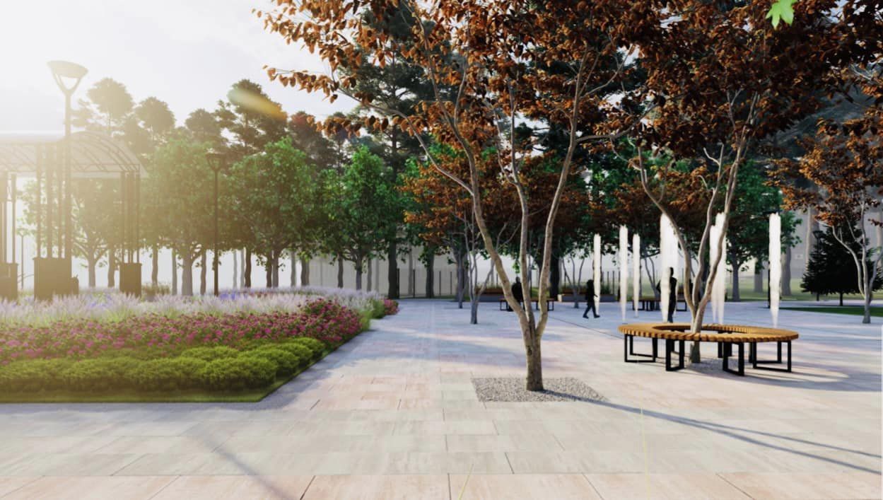 Специалисты разработали визуализацию сквера, где предусмотрены широкие аллеи и клумбы с декоративными цветами, интерактивные фонтаны, детская игровая зона, а также уличные скамьи.