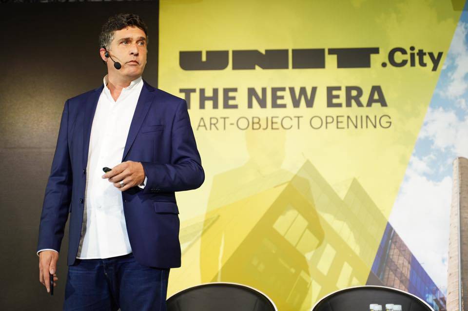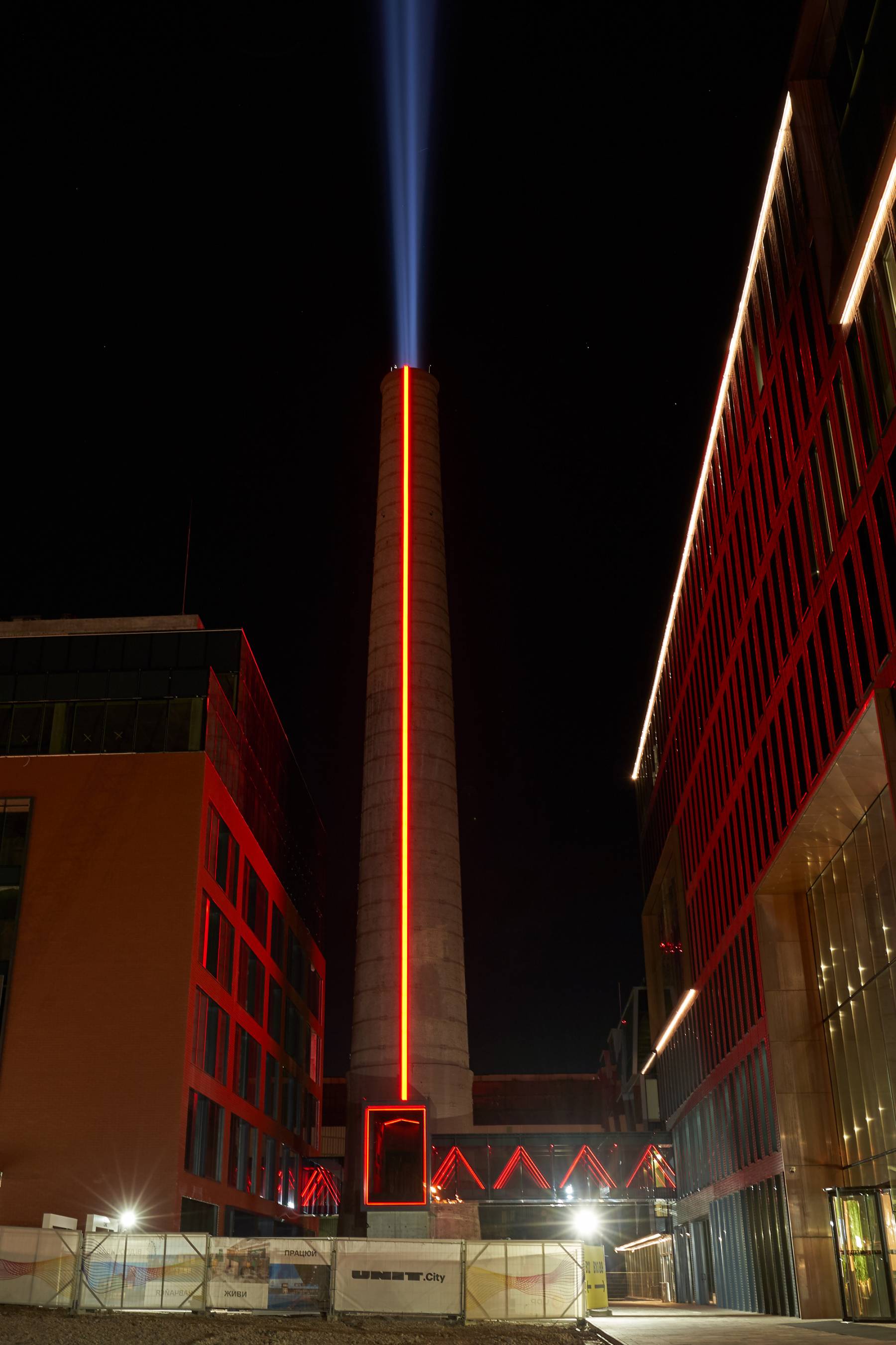 Как символ «Новой эры» в UNIT.City открыли арт-инсталляцию «Маяк». Это прожектор, который будет излучать яркий свет в темное время суток.