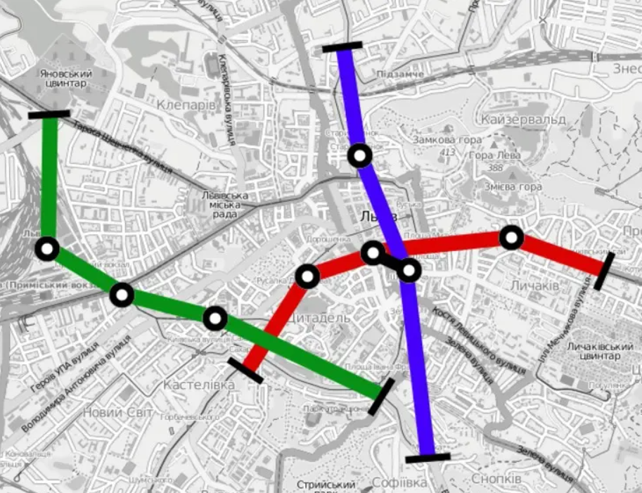 План имел 3 ветки и преследовал цель разгрузить наземные маршруты. Сначала должны были построить 2 из них, синюю и красную, протяженностью 5,5 км. Зеленую планировали строить позже от Стрыйского рынка до вокзала.