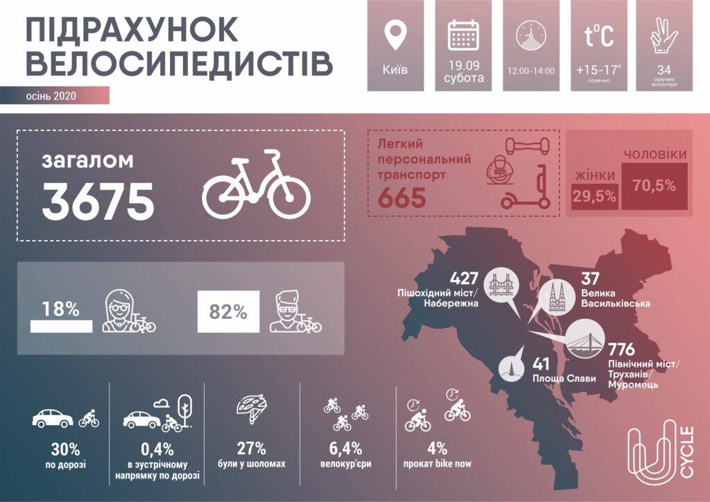 Исследование проводили на протяжении десяти дней (9-19 сентября) на 22-х перекрестках в Киеве. За два часа в будний день активисты насчитали 4 569 велосипедистов (в 2019 году – 1798), а в выходной – 3 675 (в прошлом году – 1943). По словам экспертов, на это повлиял карантин и увеличение количества велодорожек.