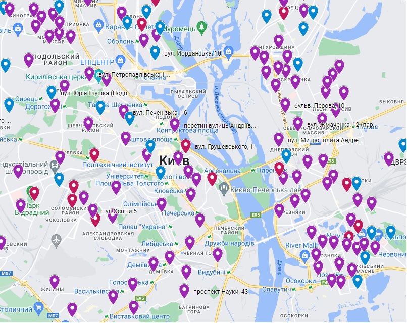 Карту размещения бюветов в Киеве обновили, в частности, там теперь обозначены фиолетовым все комплексы, имеющие возможность подключения к генератору.