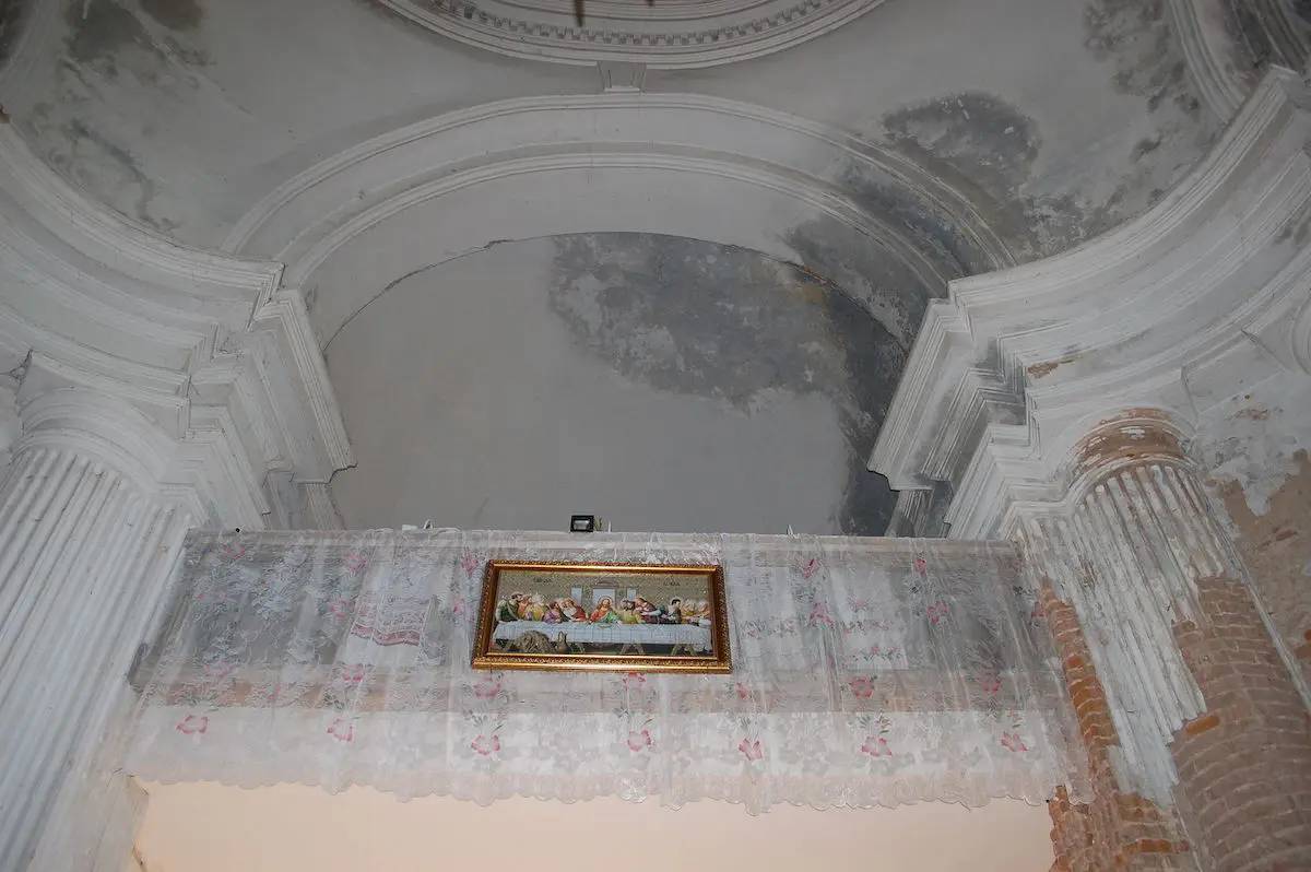 На фото видно, что украшавшие стены фрески не сохранились. Не сохранились и иконостас, а также другие иконы и церковная утварь.