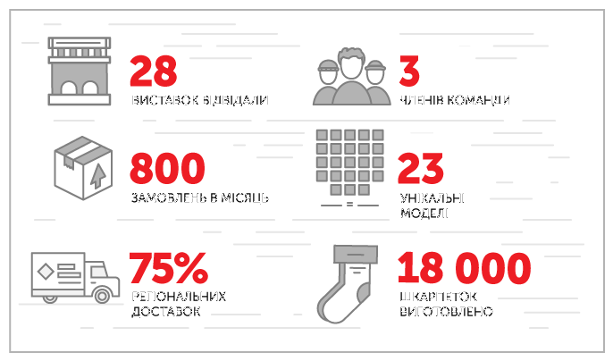 За год работы Love My Socks удалось запустить интернет-магазин, развить широкую сеть дистрибуции среди магазинов украинских дизайнеров, посетить 28 выставок и произвести 18 000 пар носков.