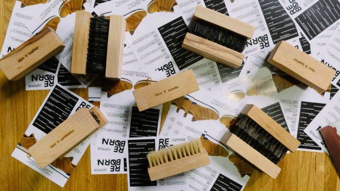 Reborn также запустили свою линию средств и аксессуаров по уходу за обувью, куда входят щетки для разных типов обуви из щетины, ворса, и универсальная пена для чистки. К ним в придачу идет инструкция по уходу в домашних условиях.