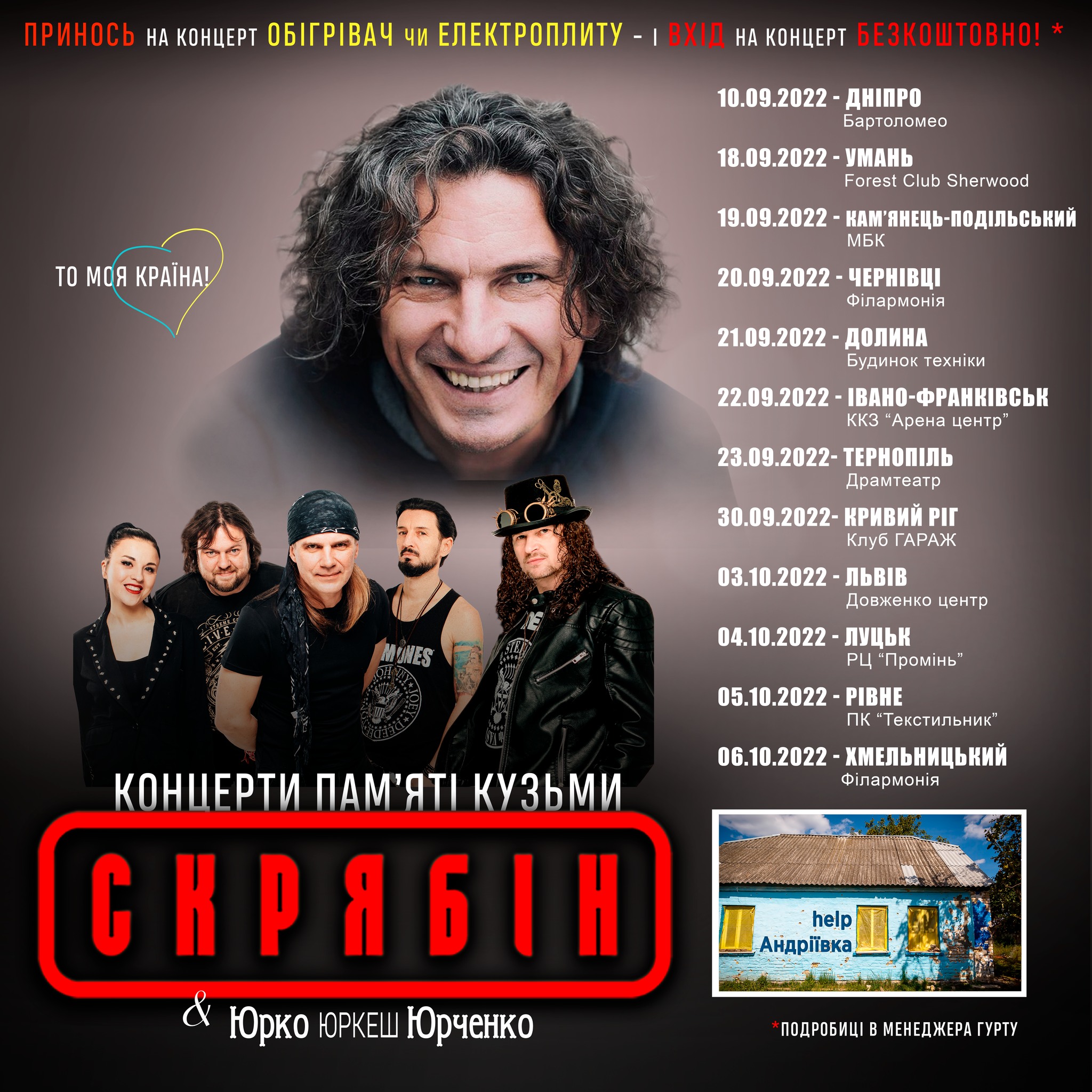 Группа «Скрябин» проводит в городах Украины благотворительные концерты, на которых вместо билетов принимает разные бытовые вещи, которые затем передает семьям на Киевщине, пострадавшим из-за российской вооруженной агрессии.