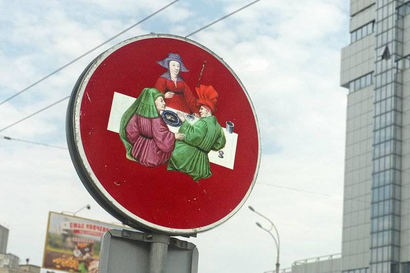 Я пробовал и немного другой формат - сделал стикер, который наклеил на дорожный знак. Там изображена компания, сидящая за столом. Когда ты выходишь со своим творчеством на улицу, ты уже таким способом формируешь городскую культуру. Например, приедет какой-то турист в Киев и пойдет фотографировать эту работу или будет с кем-то встречаться не возле памятника, а возле какой-то картинки.