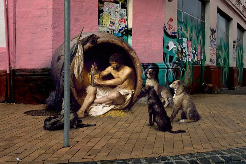 Бывает по-разному. Могу просто сфотографировать что-то во время прогулки, а потом через несколько месяцев увидеть картину и понять, что ситуация на ней как раз подходит для уже снятой локации. Или могу несколько часов просидеть, пересматривая все эти картины, а потом решить, что ради конкретного коллажа нужно поехать в определенное место и снять именно его.