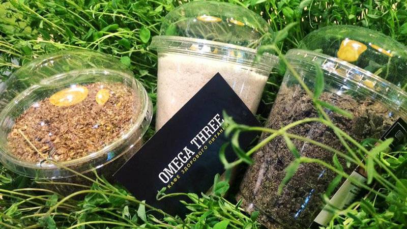 Как и положено эко-бару, в ярком интерьере Omega three много зелено-желтых оттенков и сочные стены из живой травы.