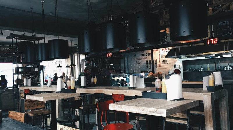 Пространство оформлено в стиле лофт с оригинальной деревянной и кованой мебелью. Кухня здесь открытая, а заведение работает по принципу самообслуживания.