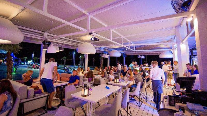 Заведение оформлено в средиземноморском стиле: белый деревянный пол, светлая мебель, хрустальные люстры, огромные вазы-амфоры с живыми цветами. Помещение соответствует названию – все столики находятся на веранде под открытым небом. Публика здесь довольно пафосная, поскольку и месторасположение, и интерьер привлекают гостей, вышедших на променад.